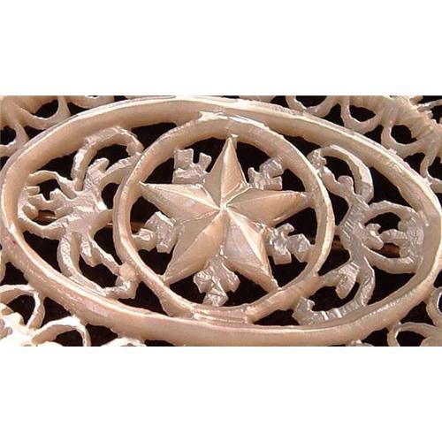 A DELICATELY CARVED MOP AND SILVER BROOCHE.THE TEXAS LONE STAR CENTERS THE BROOCHE.IT SURROUNDED BY PERFECT FILIGREE WORK IN MOTHER OF PERAL. SOME OF THIS IS AS FINE AS A HAIR. THE SILVER IS IN THE ETRUSCAN STYLE OF GRANULATION AND ROSETTES. EACH PART IS HAND MADE THEN HAND ASSEMBOLD.THIS IS THE FINEST WORK THAT I HAVE EVER SEEN!!!!!