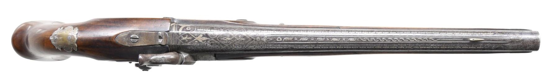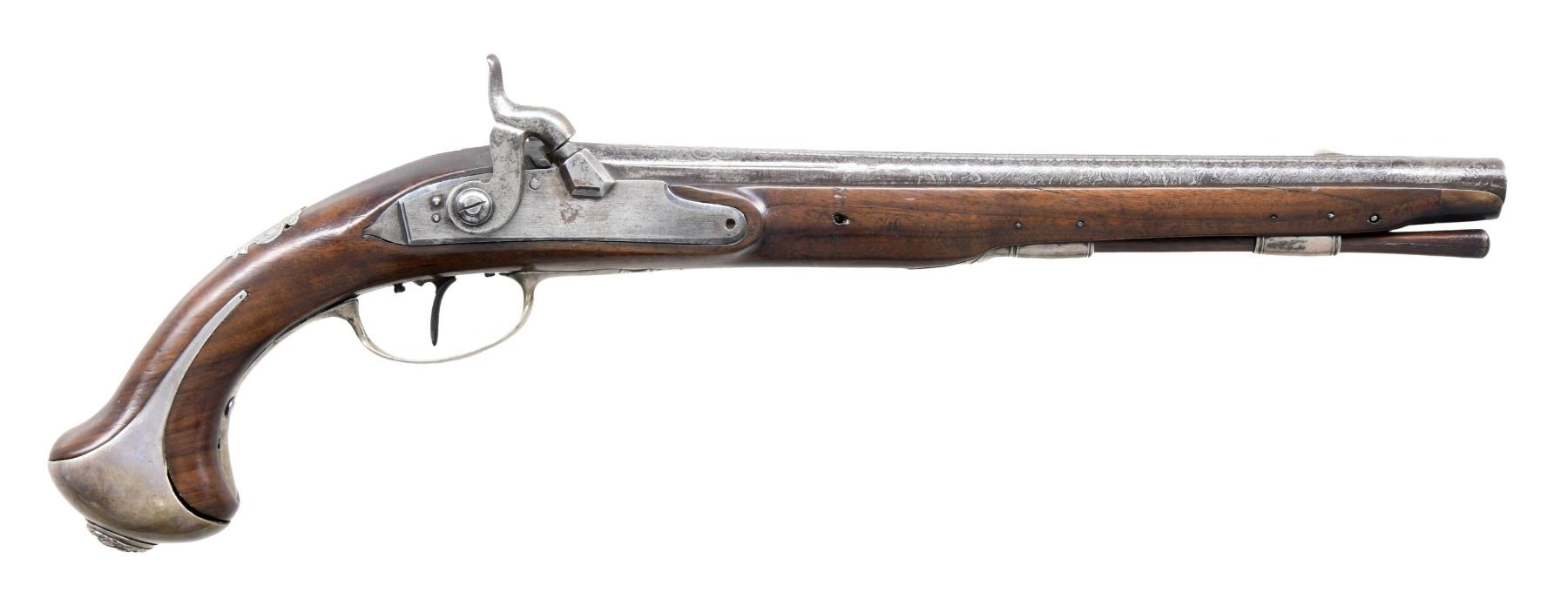 MOORISH BARREL CONVERTED TO PERCUSSION. Cal. 50. S# NSN. During the 18th Century barrels made in southern Spain or other Morrish lands were recognized as being the finest available. This well made pistol has 11-3/4" tapered round damascus barrel exhibiting very fine figure. Barrel has been meticulously filed with top rib and silver inlaid with Arabesque patterns at rear and scrolled and dotted decoration along rib. Flint lock with chamfered plate and rebated tail has been converted to percussion with bolster and flat faced hammer. Trigger is set. Dense walnut stock extends to muzzle with horn tip and is pinned to barrel. Stock is silver mounted with unengraved grip cap which has side spurs. A grotesque face is on bottom. Pierced side plate is relief cast with scrolling acanthus and floral highlights. Trigger guard has foliate finial. A crowned silver crest plate is at top of grip. Walnut ramrod mounts through single beaded pipe and matching thimble. CONDITION: good. Barrel shows cleaning to silver gray over some very light pitting but retains nearly all filed and inlaid detail. Lock is cleaned to silver with some brown staining. Stock shows oil refinish with some loss of detail but is sound, with few flaws except some light checks on right side of barrel channel. Silver once cleaned bright is toning. Bore is lightly pitted. Mechanically good. Set trigger working. (01-26002/MGM). ANTIQUE. $1,200-1,800.