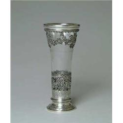 Lot 496 SILVER MOUNTED VASE. Wonderful clear glass vase has etched and wheelcarved band of flowers around waist with silver lip and collar with garlands of flowers draping around vase. Within garlands are wonderful three-dimensional faces. Vase is mounted within a silver base with matching garlands and faces and a silver engraved foot. Monogrammed at foot "M L B" and silver is marked on underside "Germany 800". SIZE: 11-1/4" t. CONDITION: Very good to excellent. 5-70196 (700-1,000)