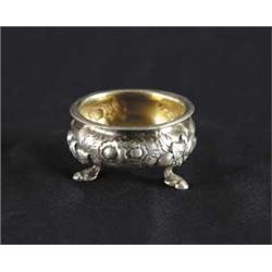 Lot 1627 SILVER OPEN SALT. Repousse work of flowers in a kettle shaped salt having three shaped legs and feet adorned with grapes and leaves. Marked “S. H. G. F. B & Co.”. Monogram to base and gold wash interior. SIZE: 1-3/4” h x 2-3/4” dia. CONDITION: Good. 9-96078 (75-125)