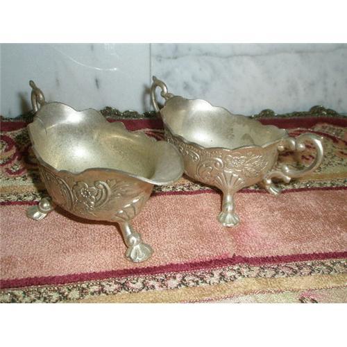 WE PRESENT TO YOU THIS CREAMER AND SUGAR SET OF SILVER OVERLAY, DESIGNED LIKE THE OLD BATHTUB. SHOWING ORNATELY TOOLED W/SCROLLS CENTERING AND FLORAL CLUSTERS, DECORATIVE CLAW FEET THREE ON THE CREAMER AND FOUR ON THE SUGAR. BOTH HAVE HANDLE/S ONE ON THE CREAMER, TWO ON THE SUGAR. OH! EACH PIECE, (BOTH) RIGHT BY THE HANDLE, HAS A 1/4" LONG, VERY THIN, FRACTURE. THEY BOTH LOOK AS THOUGH IT WOULD BE A MANUFACTURE DEFECT.DOES NOT DISTRACT FROM DISPLAY. VERY RARE AND COLLECTIBLE.