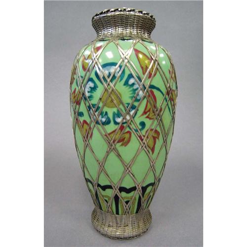 SILVER OVER PORCELAIN VASE fine floral decoration