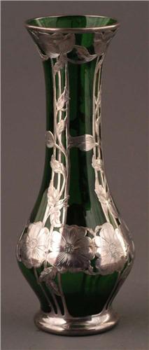 SILVER OVERLAY VASE 10" high circa 1900 <BR>condition: excellent with 3 small flakes at edge of overlay near base (the largest 5mmx2mm and very shallow)