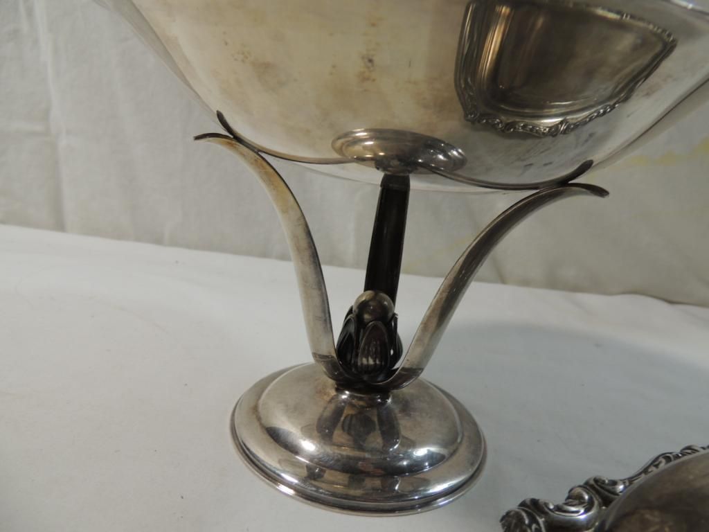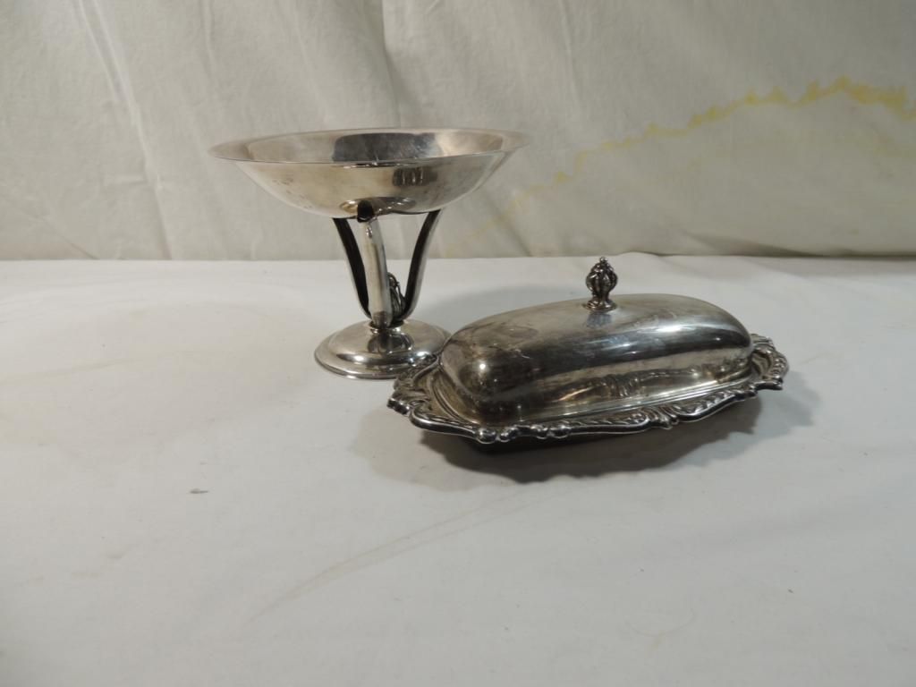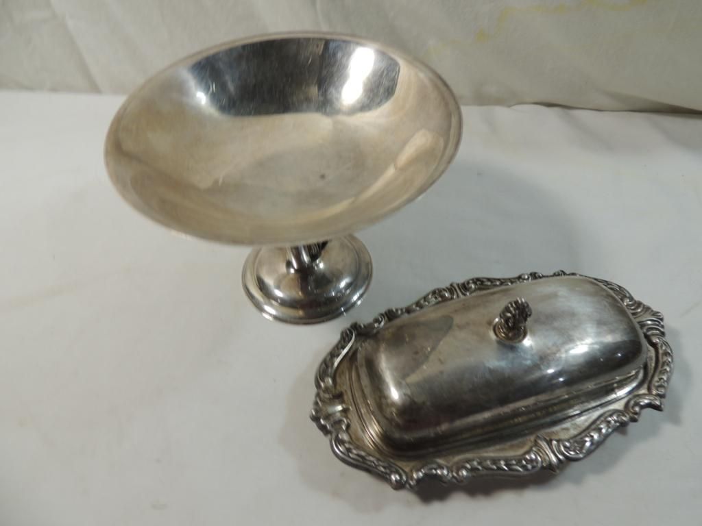SILVERTONE SILVER PLATED? BUTTER DISH, CANDY DISH PEDISTAL DISH COLLECTIBLE VINTAGE AS SHOWN SEE PHOTO FOR MORE DETAILS.