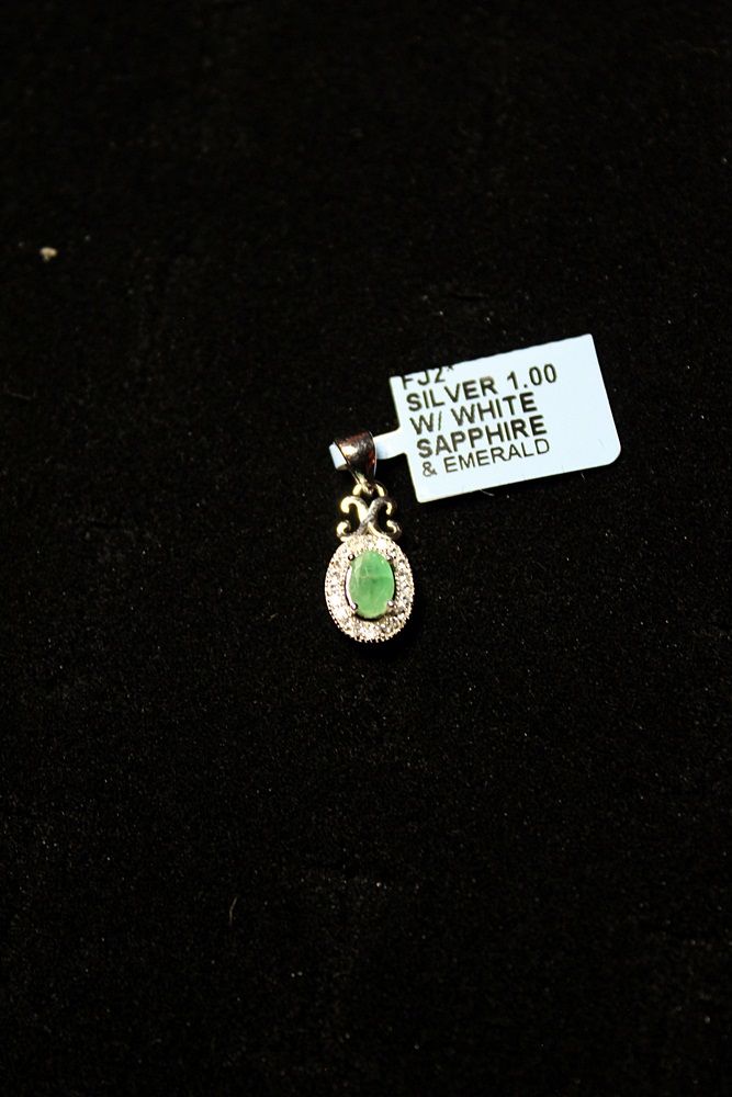SILVER PENDENT WITH EMERALD AND WHITE SAPPHIRE. SILVER: 1.00G. RETAIL PRICE $290.00.