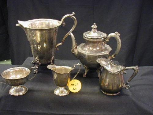 SILVER PLATE ASST. LOT INCLUDES (1) HOMAN CREAMER #0650 & (1) MATCHING SUGAR #0650, (1) EUREKA SILVER PLATE PITCHER #116, (1) 9 1/2in WATER PITCHER SILVER PLATE L.B., (1) 8 1/2in FTD. TEA POT (W/CRACK ON BODY) 5 PC