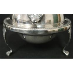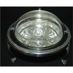 SILVER PLATE COVERED CHEESE DISH. Has clear glass insert & rotating lid. Marked on bottom "Rogers Silver-Silver on Copper". 4" H