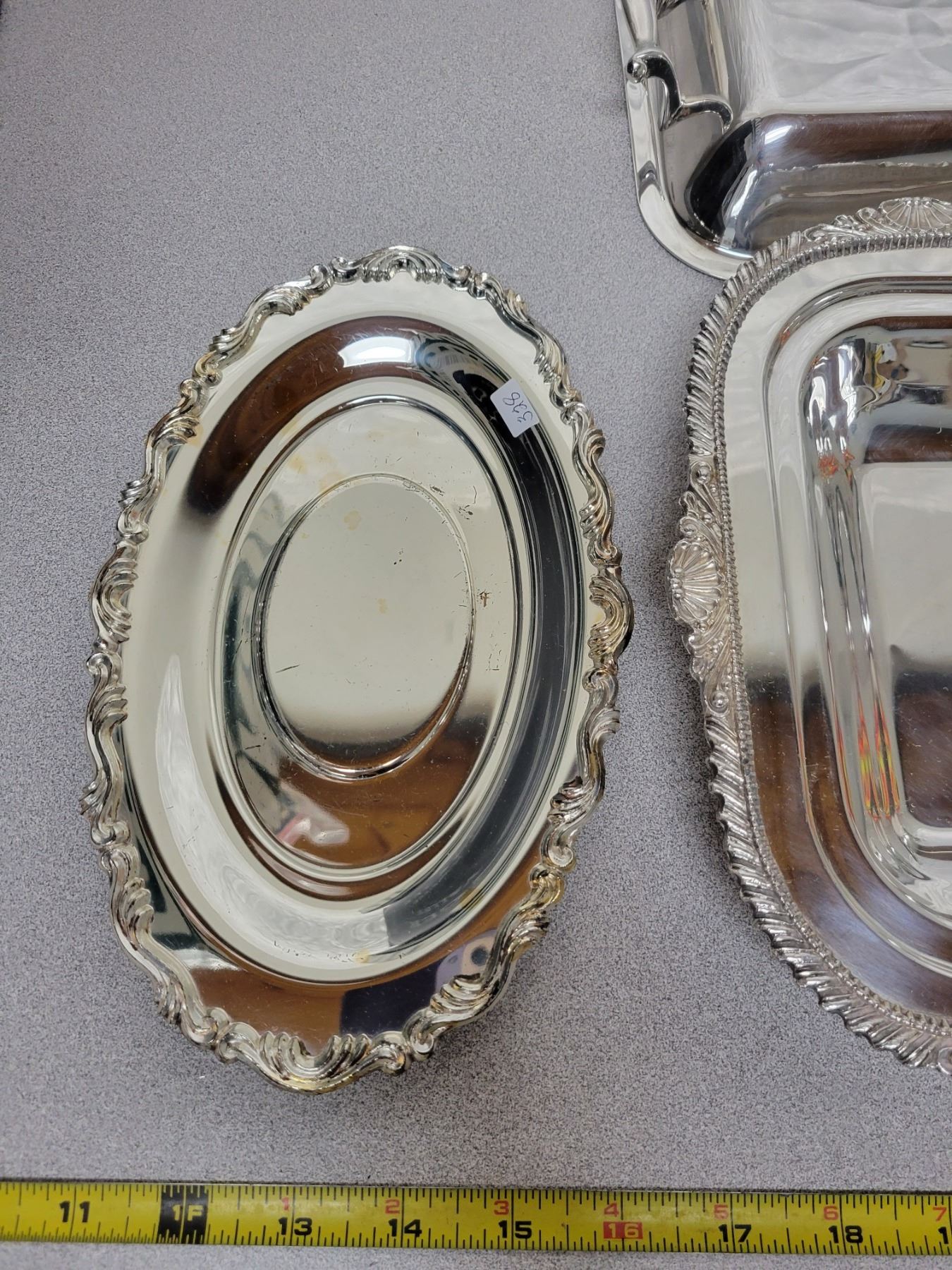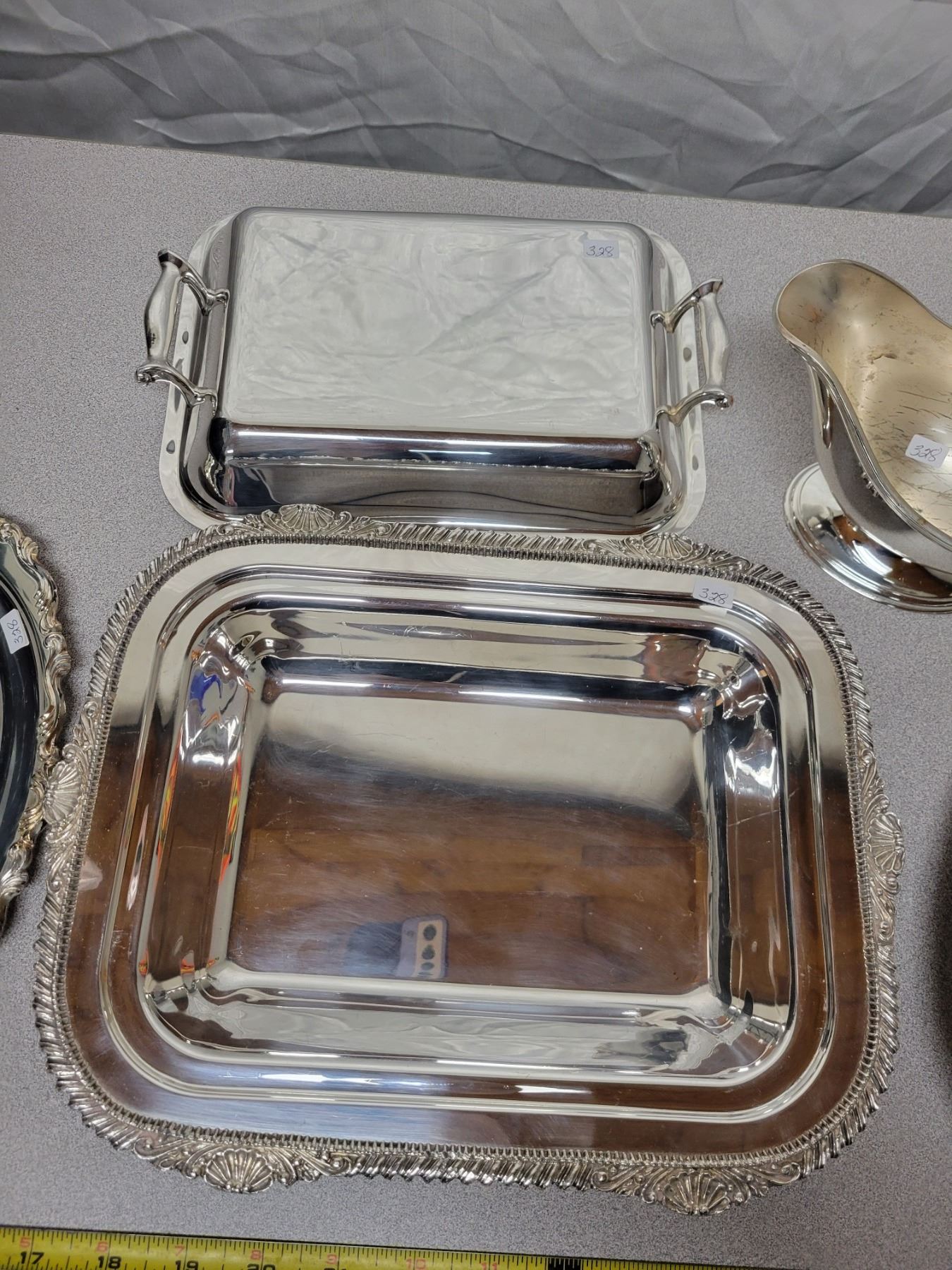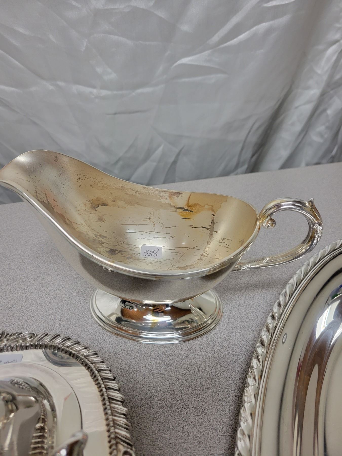 SILVER PLATE SERVING DISH, SAUCE BOAT & TRAY & TRAY