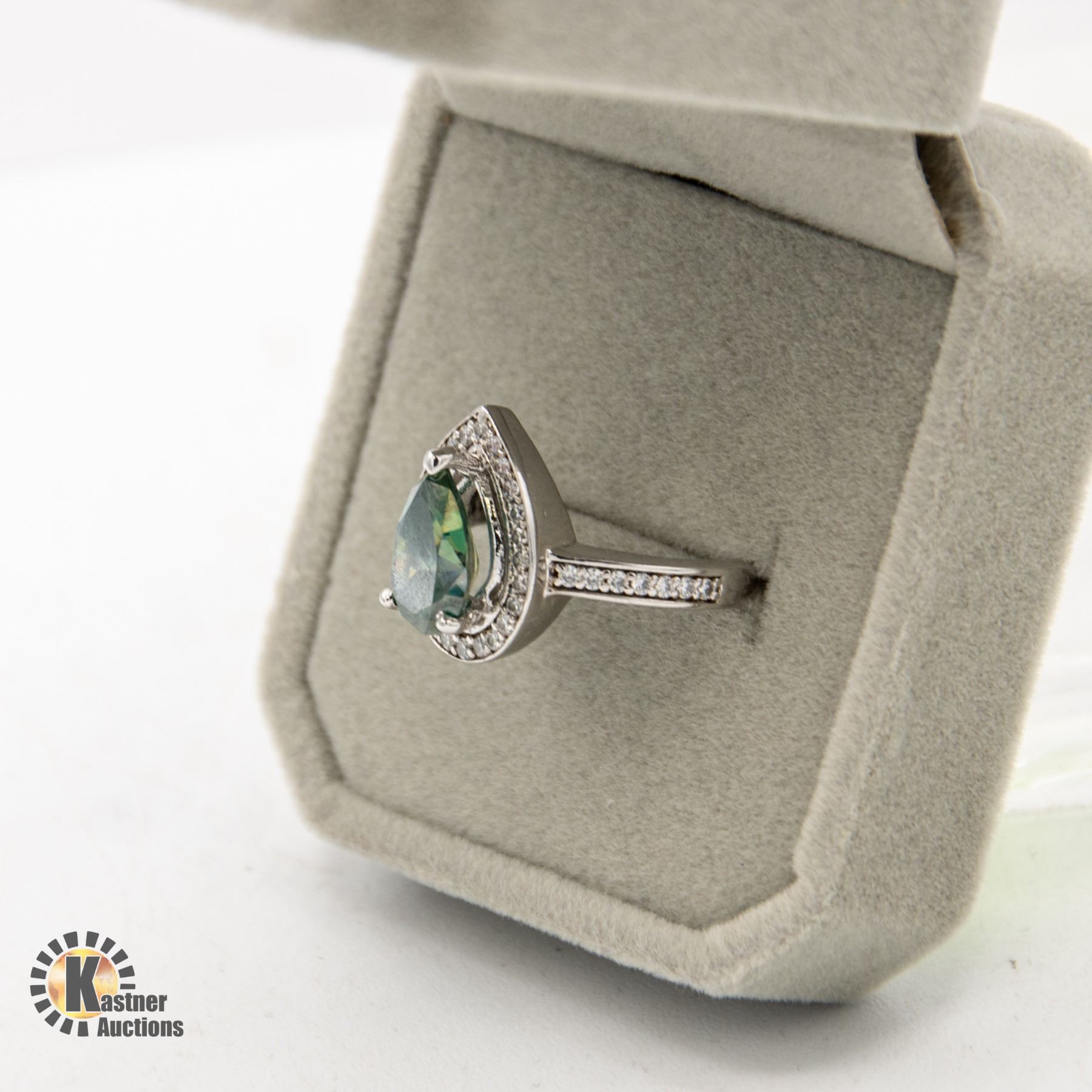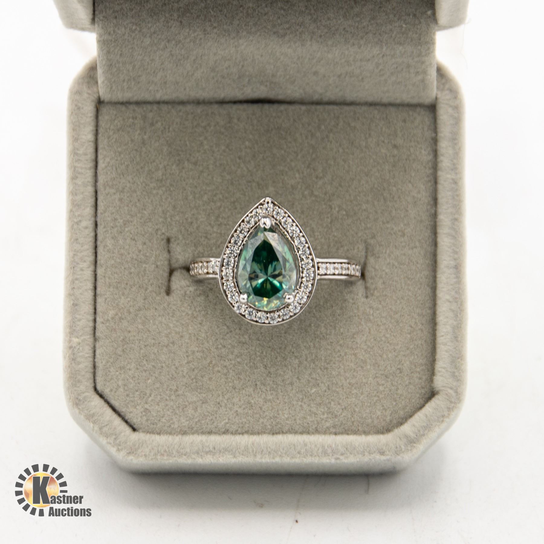 RING WEIGHING AN ESTIMATED 1.80 CARAT SET IN SILVER PLATED BAND ABOVE A 39 CUBIC ZIRCONIA HALO WITH OTHERS IN THE SHANK WEIGHING A TOTAL 0.40 CARATS. THE RING IS SIZE 7.25 APPRAISED VALUE $1,400.00 **ALL ITEMS MUST BE REMOVED BY 5PM SATURDAY, DECEMBER 2ND 2023. ALL REMAINING ITEMS WILL BE SUBJECT TO A $6.00 PER DAY STORAGE CHARGE. ANY ITEMS REMAINING AFTER MONDAY, DECEMBER 18TH, 2023 WILL BE CONSIDERED FORFEITED. NO REFUNDS WILL BE ISSUED FOR FORFEITED ITEMS. TO SCHEDULE A PICK UP APPOINTMENT CLICK HERE