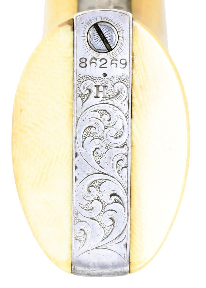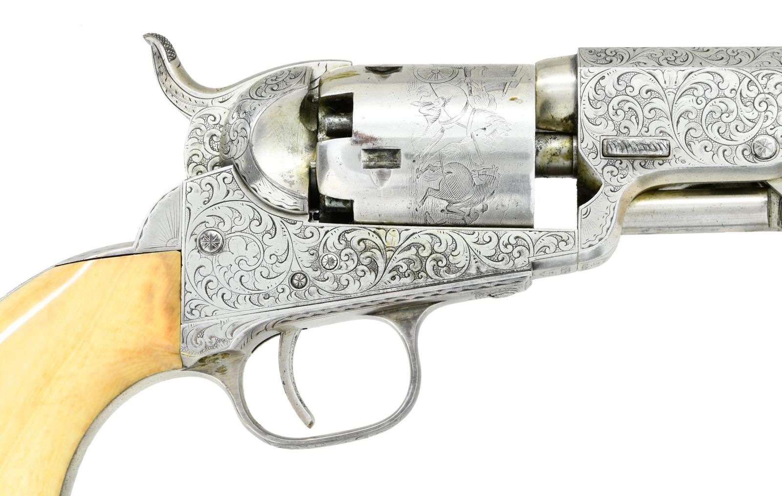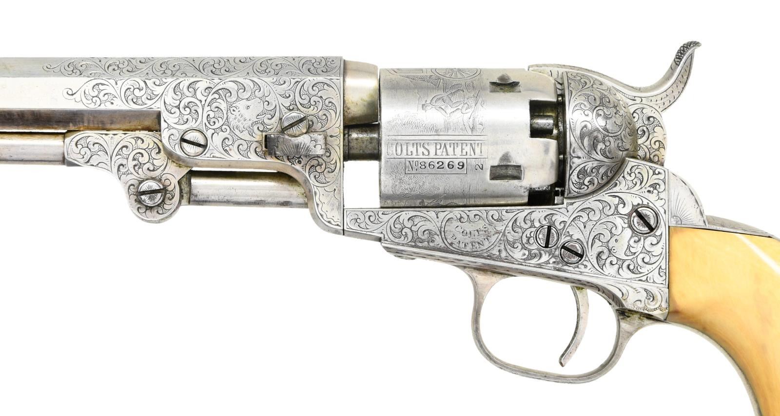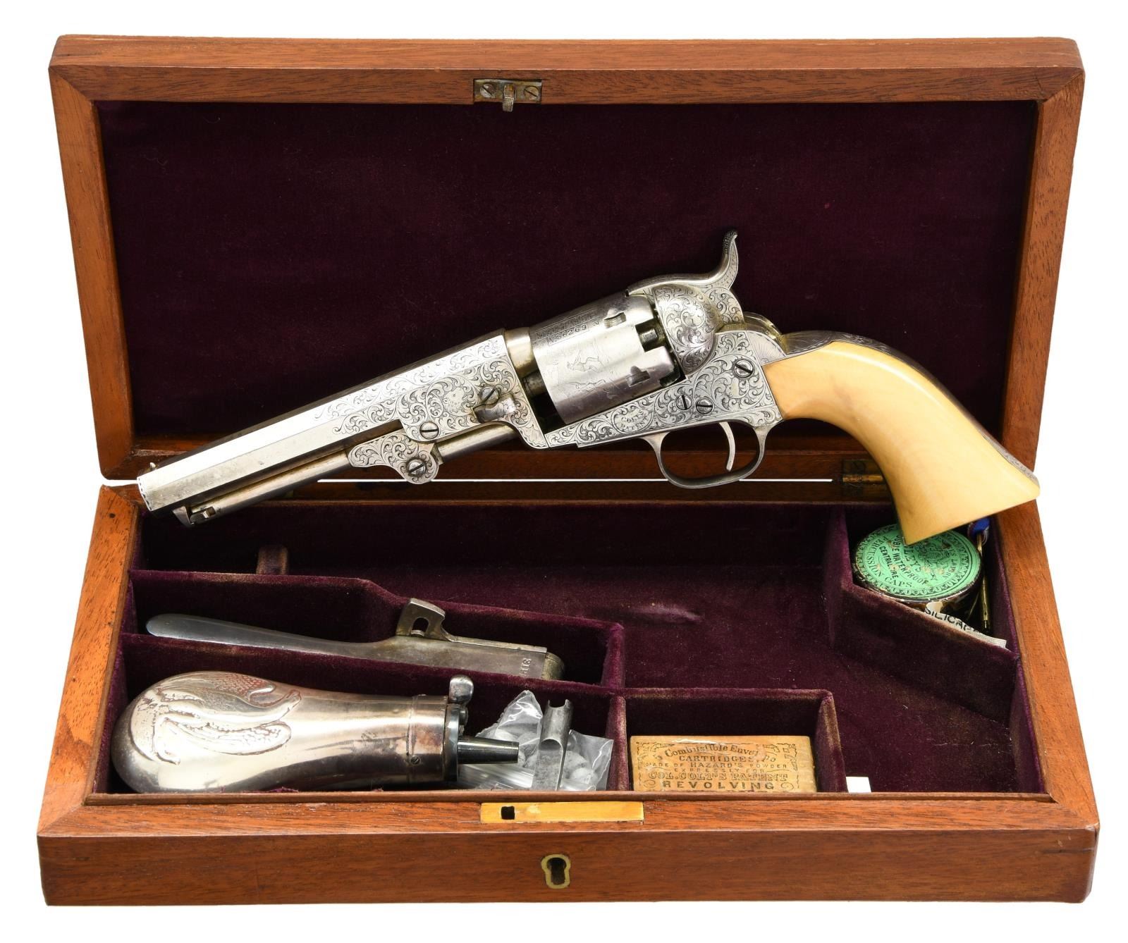 1849 POCKET MODEL REVOLVER, LISTED BY SERIAL NUMBER IN GUSTAVE YOUNG LEDGER, 1854. Cal. 31. S# 86269. This beautiful silver plated 5 inch pocket model is listed by serial number in Gustave Young's Ledger which is institutionalized at the Raymond Baldwin museum in Hartford. R.L Wilson in his text "The Colt Engraving Book" states there are very few serial numbers known of the approximate 250 numbers listed in the Gustave Young ledgers. The finest scroll engraving is full coverage on both sides a frame, barrel lug, loading arm pivot, and hammer. Backstrap has full coverage on butt and half of backstrap. Trigger guard is engraved on bottom of bow, each serial number is frame engraved. Scrolls terminate into animal heads & flowers. "Sam'l Colt" engraved on top of barrel & "COLTS PATENT" on the left side of frame. Every screw head is original with engraved design. Pistol is housed in compartmented Colt green velvet lined walnut casing with two-sided eagle flask, COLT PATENT two-cavity brass mold, ELY cap tin, Pack of five combustible cartridges, and loose rounds. This is a very attractive uncleaned dark gun with well discerned crisp engraving and cylinder scene. CONDITION: fine overall, all original and matching, 95% silver plating remains, date plating applied unknown, but engraving still crisp and cylinder scene is all discernible. All 5 safety pins are crisp and functional. Mechanically fine with crisp shiny rifled bore. Grips are well fit with smooth aged ivory patina. Accompanying casing is very good, mold and flask are replated silver. PROVENANCE: Bill Sisney 1998, Collection of Horst Kreiner. (01-23985/JS). $6,000-8,000.