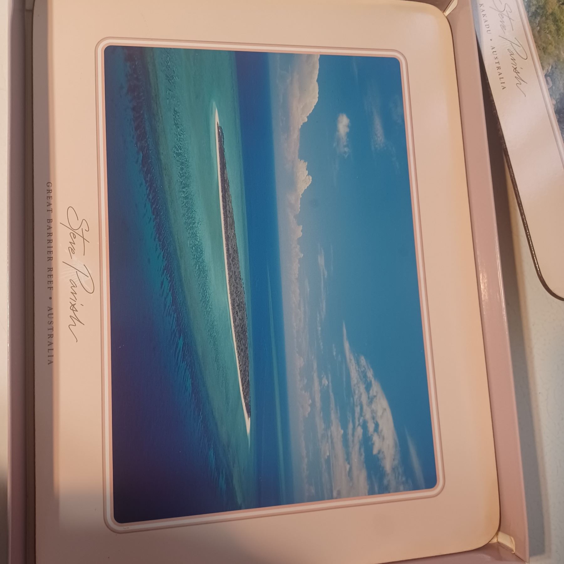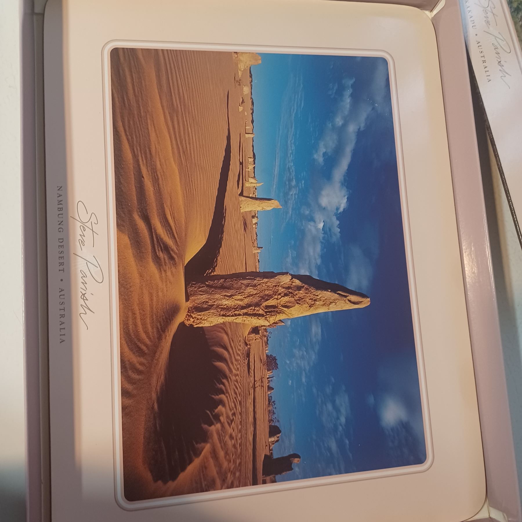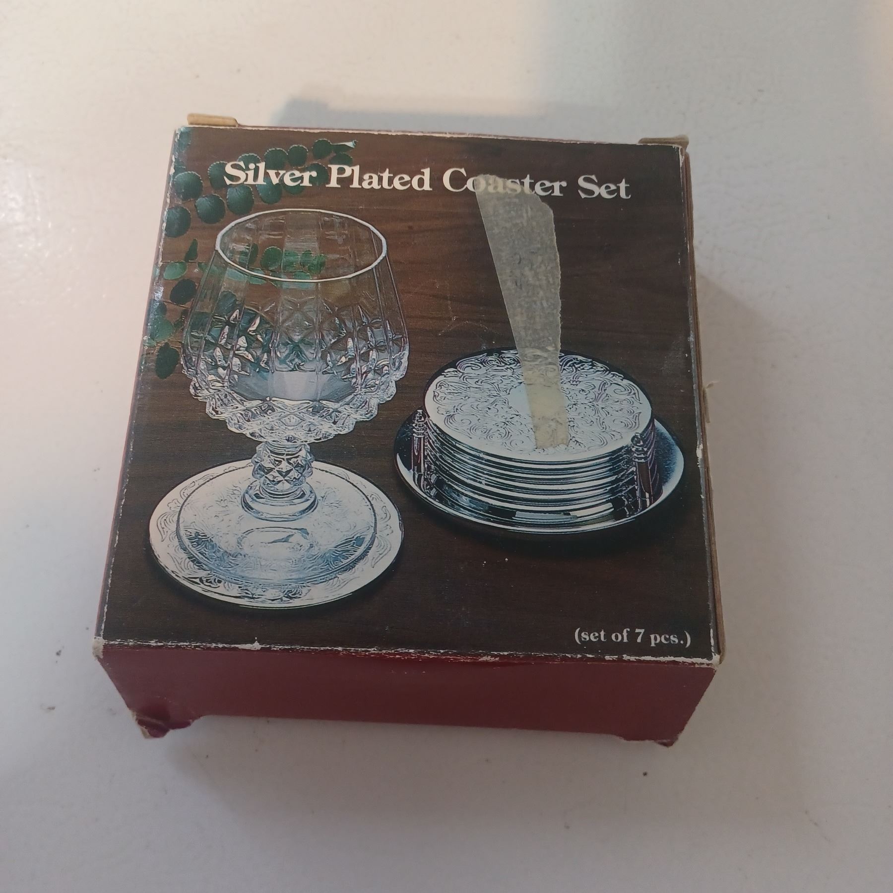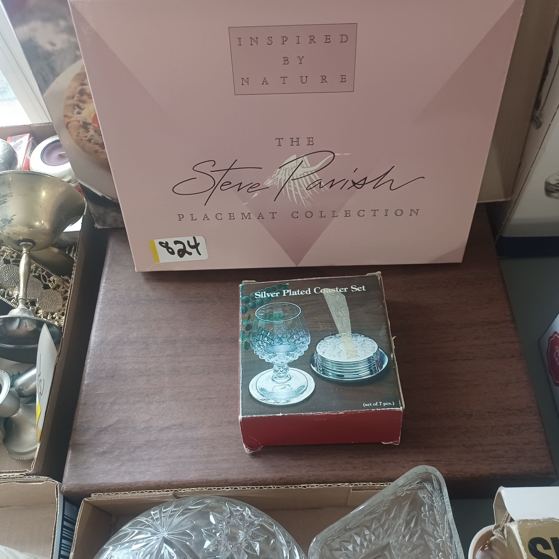 SILVER PLATED COASTER SET, 6 STEVE PARISH PLACEMATS AND CUTTLERY SET IN BOX