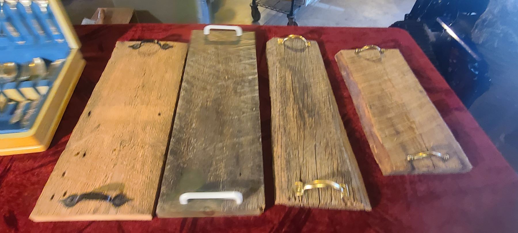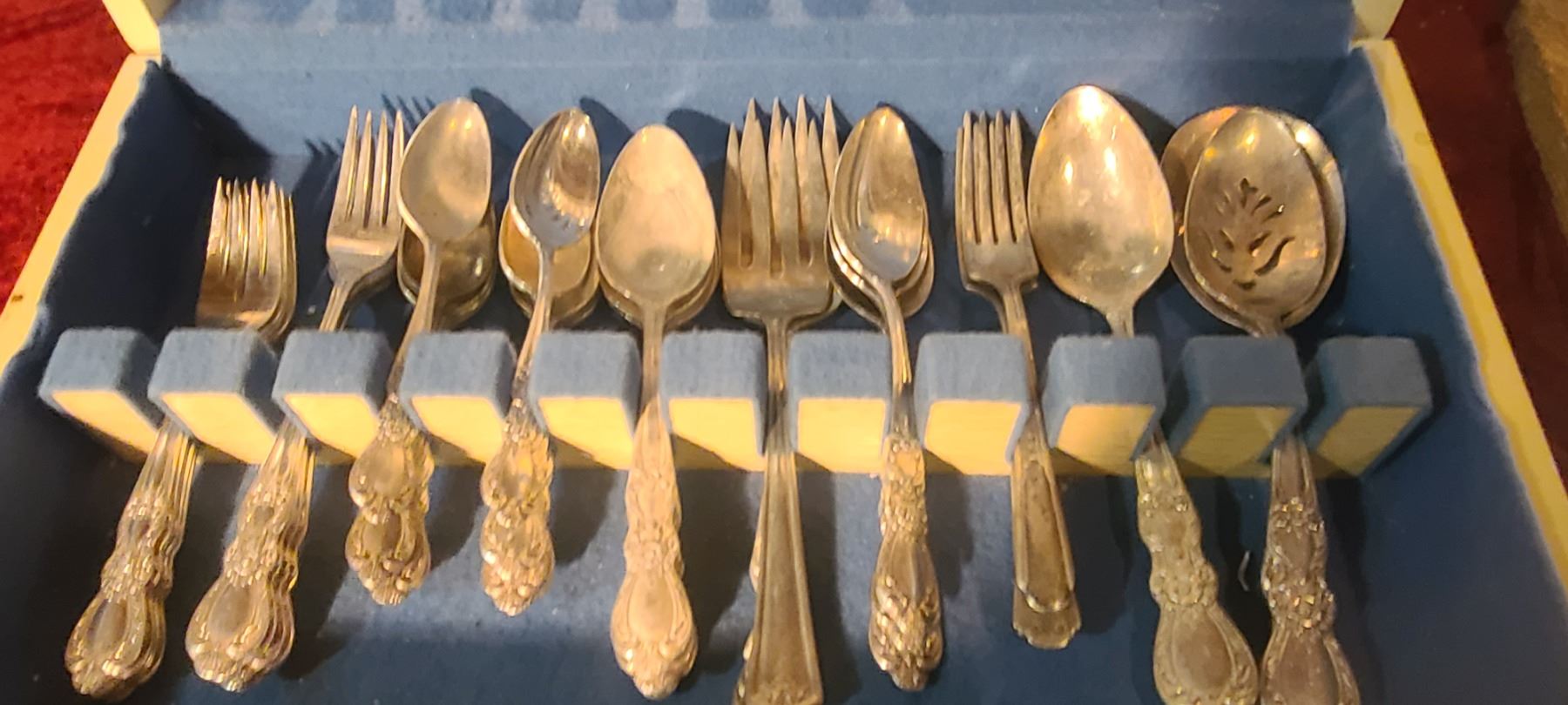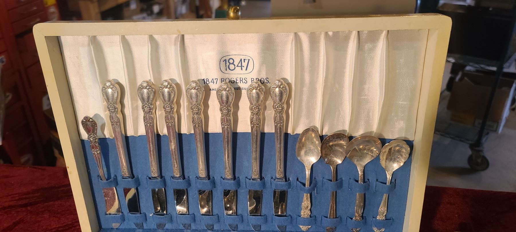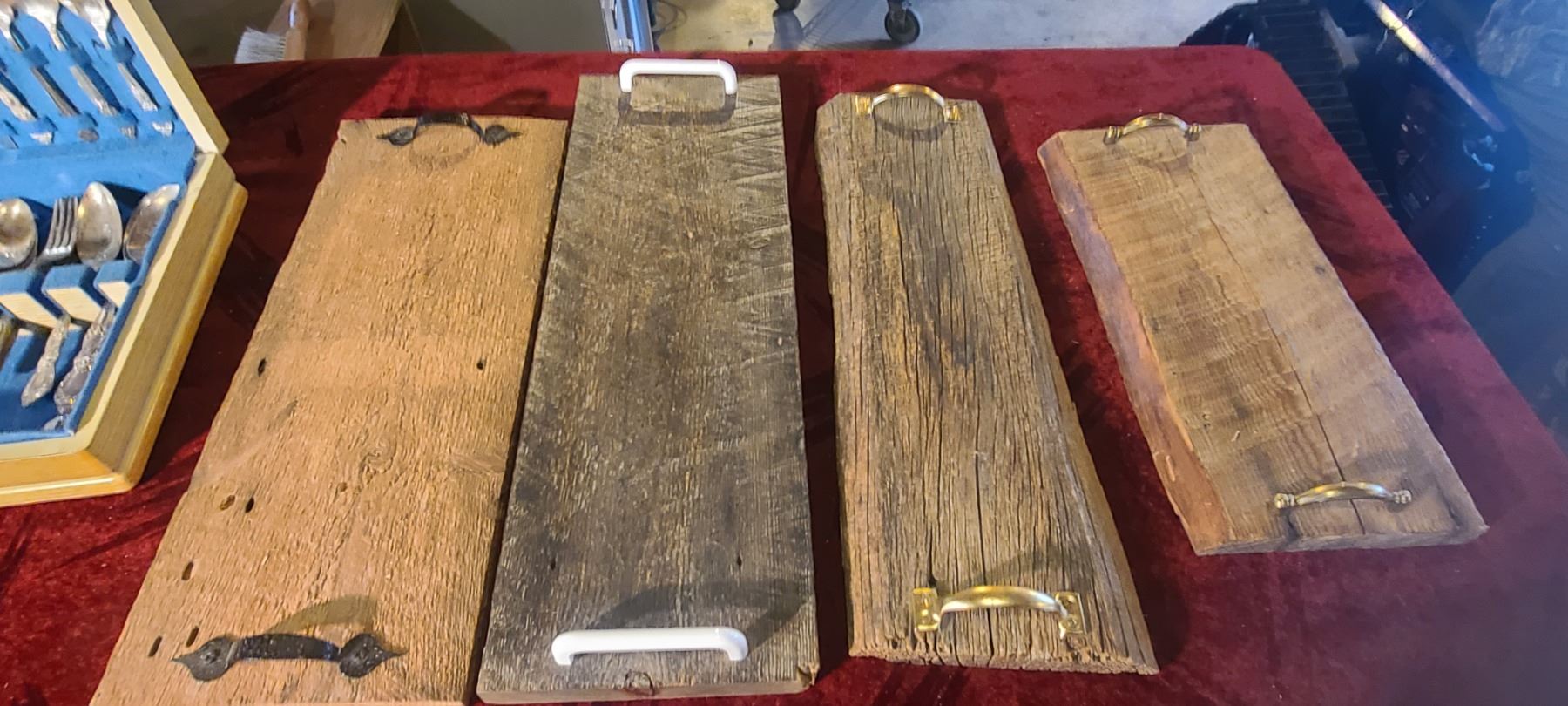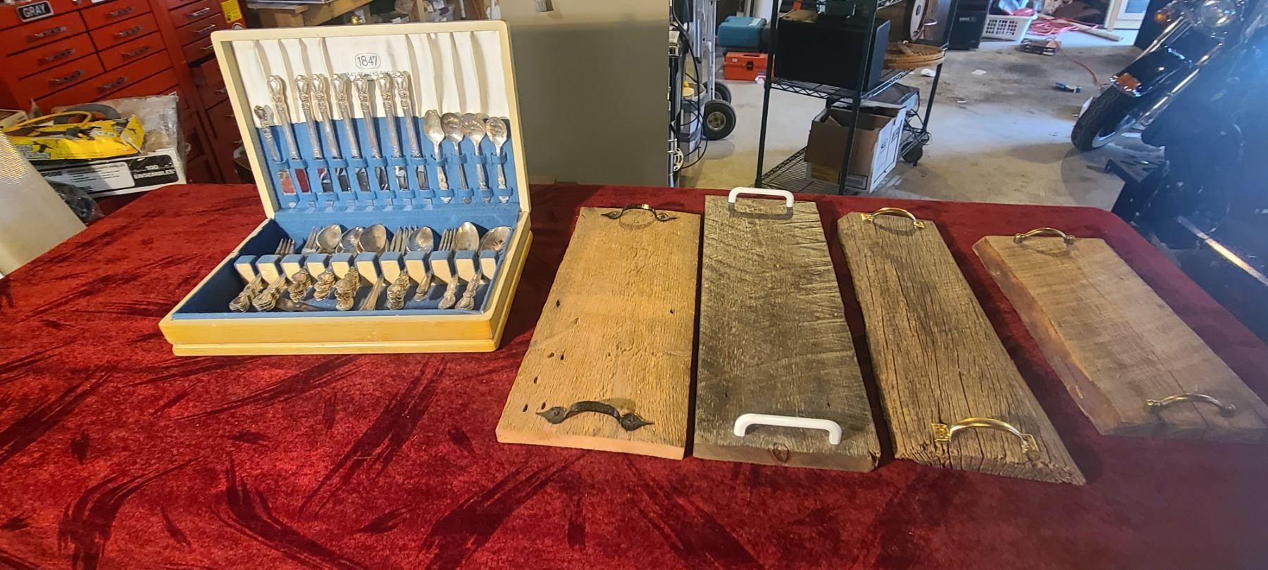 SILVER PLATED CUTTLERY SET BY 1847 ROGERS BROS. AND FOUR SERVING BOARDS