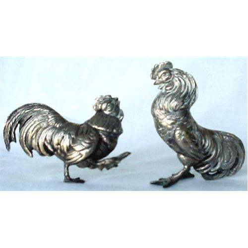 <table width="100%" border="0" cellspacing="0" cellpadding="4"><tr><td><em> </em></td></tr><tr> <td width="100%"> A pair of silver plated fighting cockerels, each in typically aggressive stance and with realistically-cast and chased plumage. <P><P> Measures:taller measures 3 1/8" high. <P><P> Condition: very good. No damage of any sort. </td></tr><tr> <td> </td></tr><tr> <td>Reference #: 504</td></tr><tr><td>Condition:See Description</td></tr><tr><td>Year:See Description</td></tr><tr><td>Title:SILVER PLATED FIGHTING COCKS - CENTERPIECES</td></tr><tr><td>Location:Boca Raton</td></tr></table>