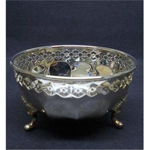 BEAUTIFUL ROUND BOWL, STANDS ON PRETTY 3 ORNATE FEET - LOVE THE OPEN WORK BORDER ON THIS PIECE - as per images - Made in England and silverplated - Excellent condition - free from dents, or cracks, It stands about 2 1/2" high and about 4 3/4" in diam., US Buyer to pay 7.00 for shipping plus insurance,THANKS.