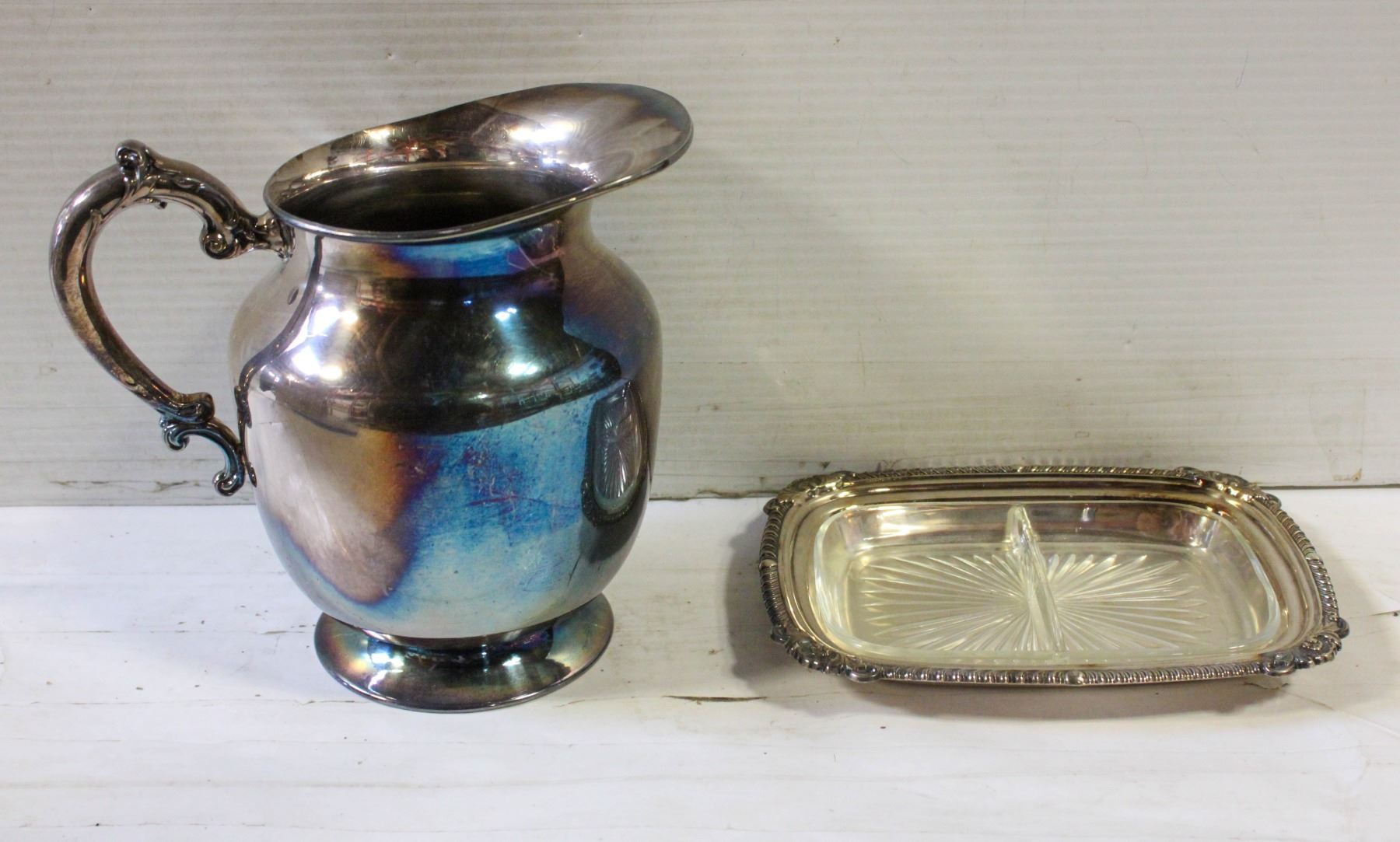 SILVER PLATED PITCHER, SILVER DISH WITH