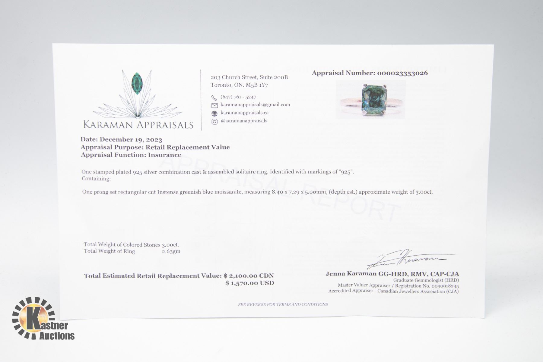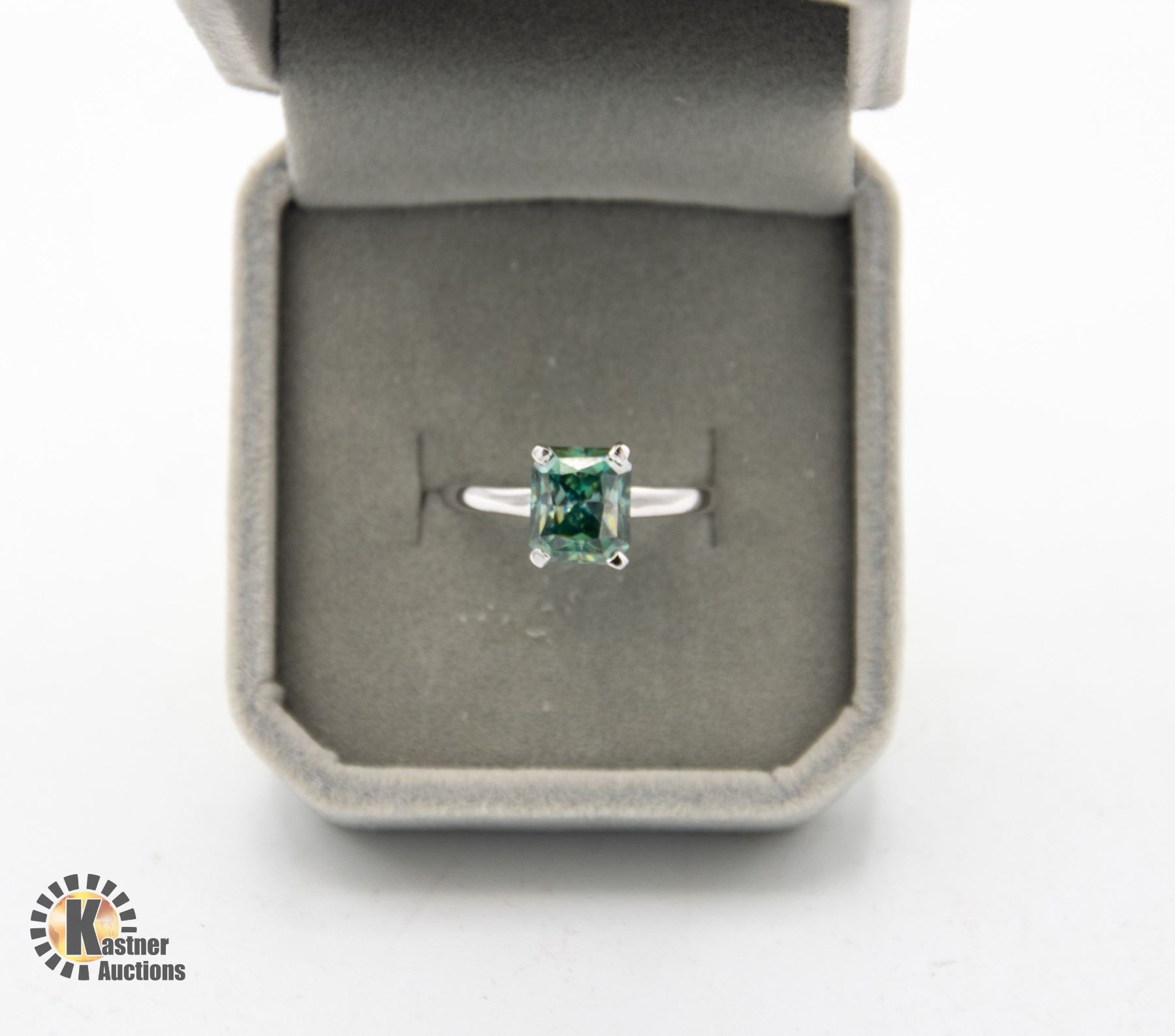 INTENSE GREENISH BLUE MOISSANITE WEIGHING APPROXIMATELY 3.00 CARATS RING SIZE 7 APPRAISED VALUE $2,100.00 **ALL ITEMS MUST BE REMOVED BY 5PM SATURDAY, JANUARY 6TH 2023. ALL REMAINING ITEMS WILL BE SUBJECT TO A $6.00 PER DAY STORAGE CHARGE. ANY ITEMS REMAINING AFTER MONDAY, JANUARY 22ND, 2023 WILL BE CONSIDERED FORFEITED. NO REFUNDS WILL BE ISSUED FOR FORFEITED ITEMS. TO SCHEDULE A PICK UP APPOINTMENT CLICK HERE