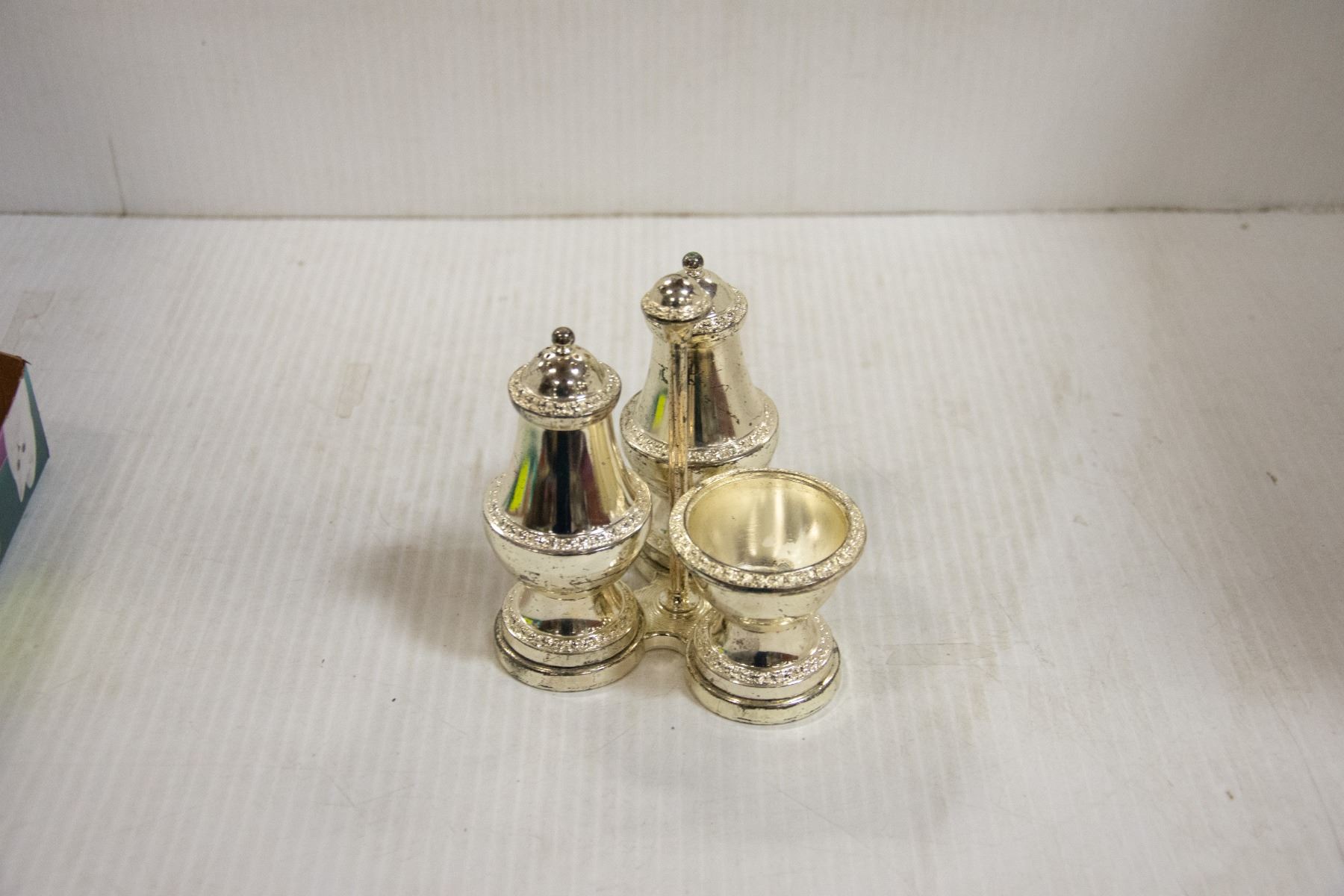 SILVER PLATED SALT/PEPPER SHAKER SET W/STAND ENG.