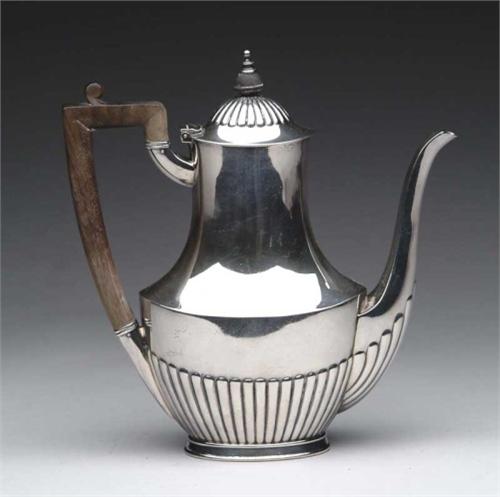 SILVER PLATED TEAPOT BY TIFFANY & CO. The Colonial shaped teapot with carved wood handle has a small silver and wood finial to the cover. The base marked with “110 2469 M”. Bottom is marked “2-1/2 Pints”. SIZE: 9” h. CONDITION: Very good, no monogram. 9-27182