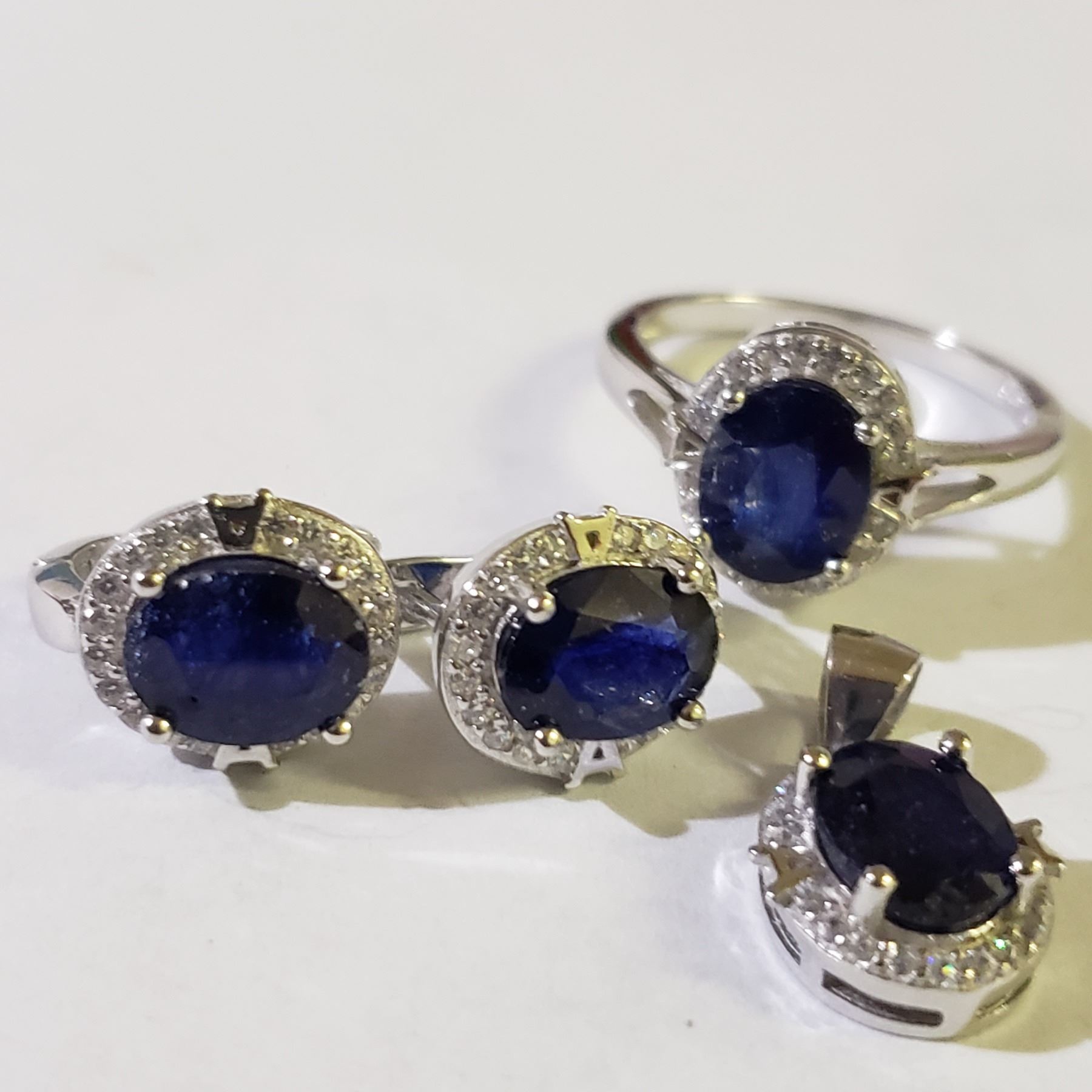 SILVER RHODIUM PLATED SAPPHIRE(10.4CT) EARRINGS, PENDANT & RING SET (~WEIGHT 8.83G),***ITEM(S) LOCATED IN LETHBRIDGE ALBERTA. ALL JEWELRY IS ELIGIBLE FOR OUR FREE TRANSPORT TO EDMONTON OFFICE SERVICE. WORLDWIDE CANADA POST SHIPPING IS AVAILABLE