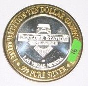 SILVER STRIKE .999 FINE SILVER $10 CASINO GAMING COIN *BOULDER STATION* COIN WEIGHS 1.34ozs TOTAL WEIGHT AND COIN HAS .60oz OF SILVER!! SILVER COIN CAME OUT OF SAFE BOX!! ***Coin, Currency & All Items Listed in this auction - Grades, Conditions and Values are not Safe Deposit Coins LLC Responsibilty. Grades, Condition and Values are determined by Consigner(s) & Buyers ONLY