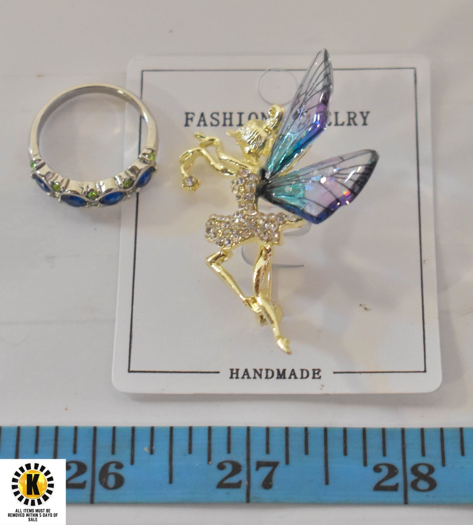 CRYSTALS AND PURPLE TO BLUE IRRIDESCENT WINGS AND SAPPHIRE BLUE AND PERIDOT GREEN CZ SIZE 8 RING. JEWELLERY