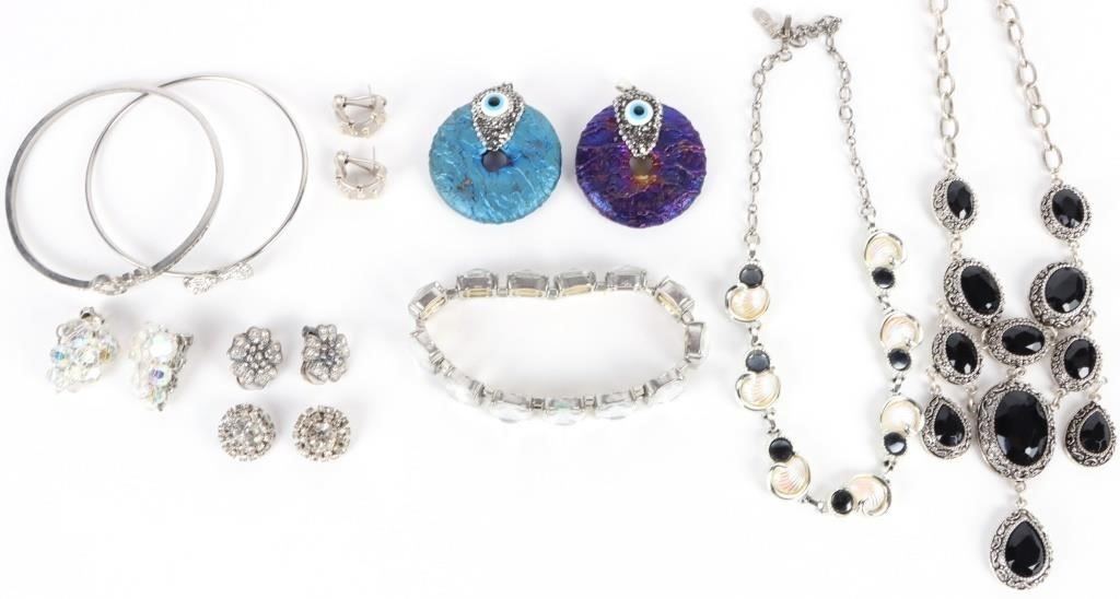 Silver Tone fashion jewelry lot of 11 to include: 2 necklaces, 3 bracelets, 2 pendants, 3 pairs of clip on earrings, one pair of pierced earrings.