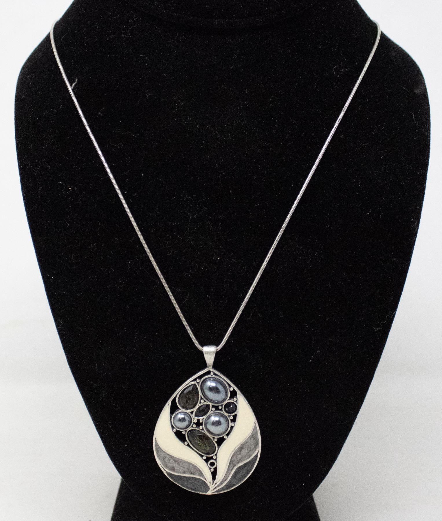 SILVER TONE GLASS INSET PENDANT AND CHAIN