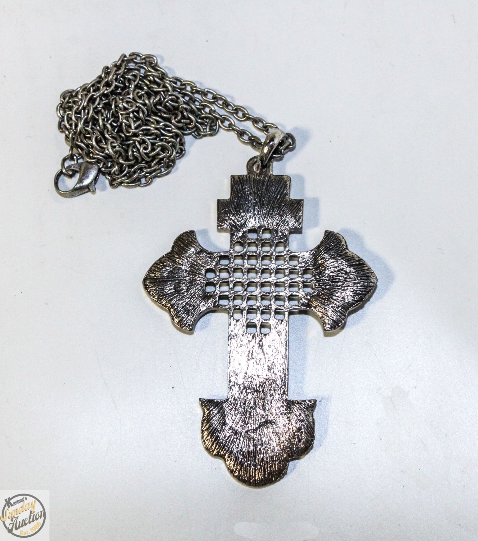 SILVER TONE JEWELED CROSS PENDANT NECKLACE