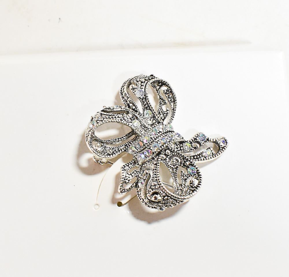 SILVER TONE MULTI COLOR STONE BOW BROOCH