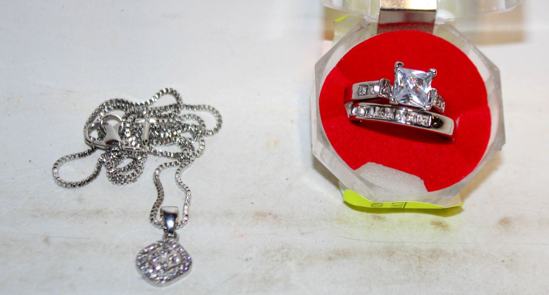 SILVER TONE WHITE STONE RINGS AND NECKLACE