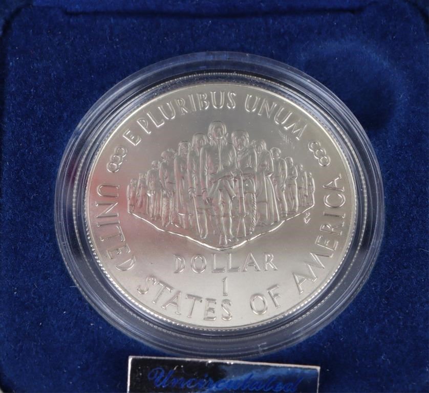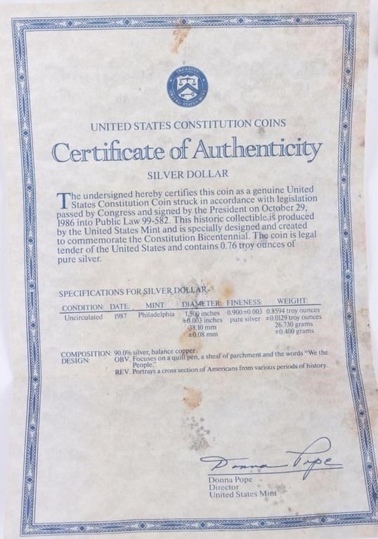 Silver US commemorative mint coins to include one 2015 US Marshals Service 225th anniversary commemorative coin program 90% silver, one 2009 Abraham Lincoln commemorative silver dollar 90% silver, and one 1987 Silver US Constitution dollar 90% silver. All coins come with COA's and original mint boxes.