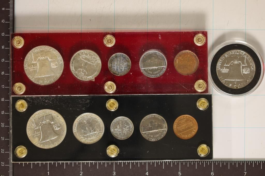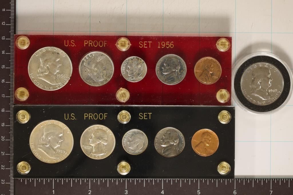 1963 PROOF FRANKLIN HALF DOLLAR IN HARD PLASTIC CAPSULE. THE 2 SILVER US PROOF SETS ARE IN PLASTIC HOLDERS