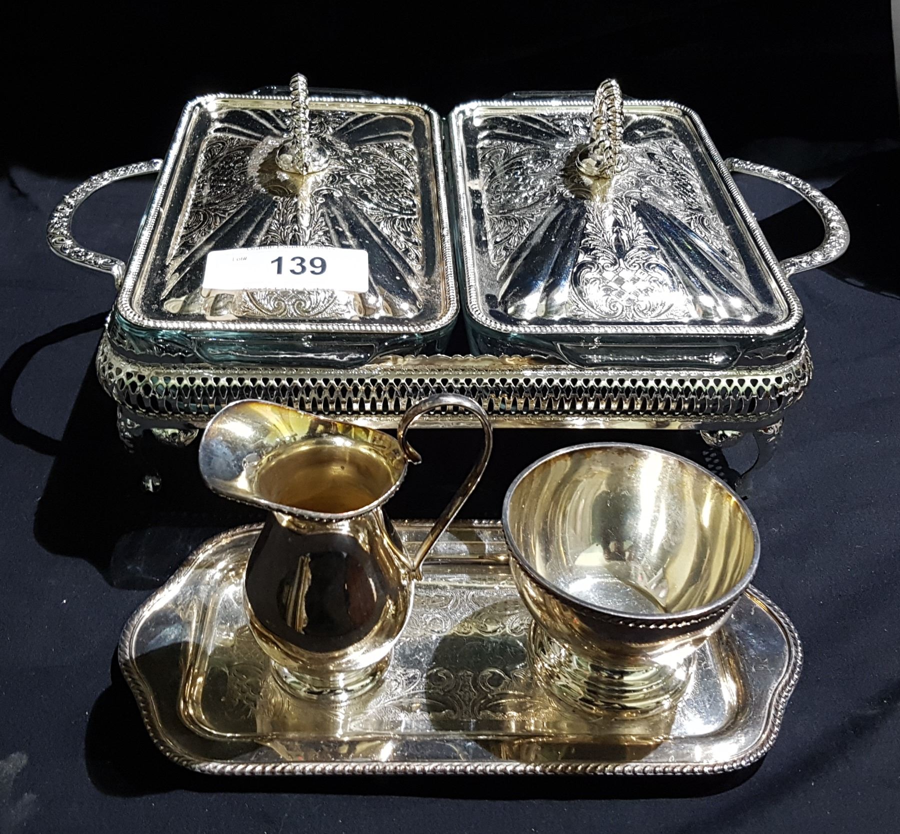 SILVERPLATE LIDDED DOUBLE SERVING DISH & CREAM & SUGAR ON TRAY