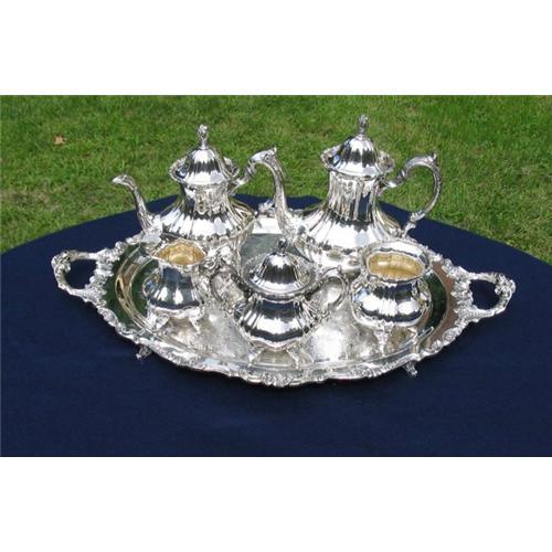 BEAUTIFUL SILVERPLATE TEA SET WITH HANDLED WAITER TRAY! </em></td>