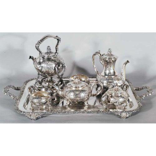 1 SILVERPLATE TEA SET with associated tray CONDITION REPORT: excellent. PACKING AND SHIPPING (excluding insurance) by Fairfield Auction to points within the Continental U.S.A. and Canada (all other international must be handled by 3rd party shipper) $80.