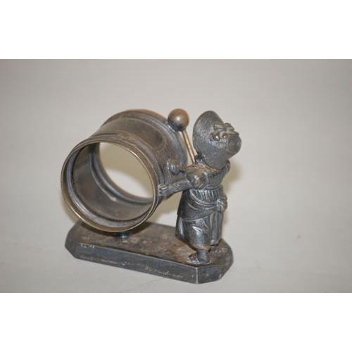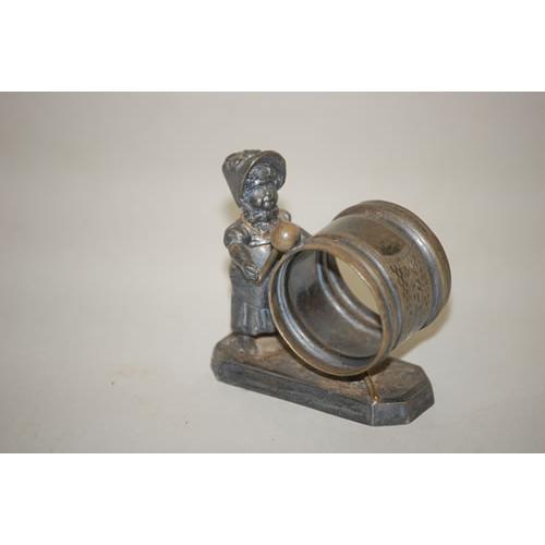 SILVERPLATED FIGURAL NAPKIN RING - VICTORIAN SILVERPLATED FIGURAL NAPKIN RING W/ KATE GREENAWAY FIGURE W/ DRUMSTICK-SIMPSON, HALL & MILLER CO. - WEAR & PLATING LOSSES