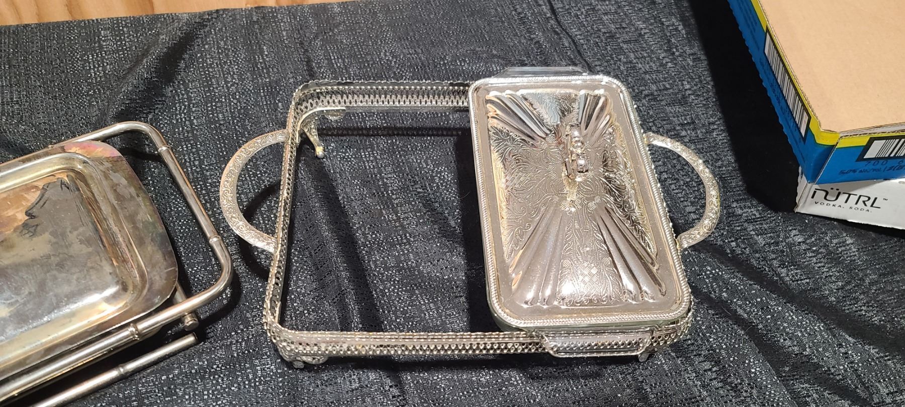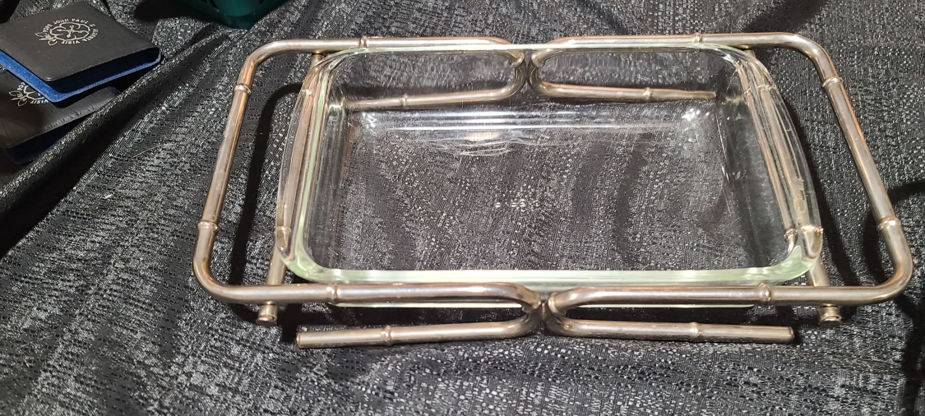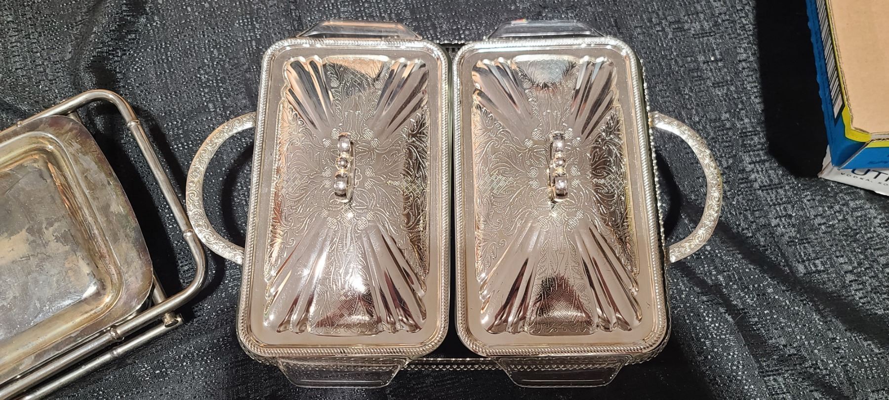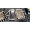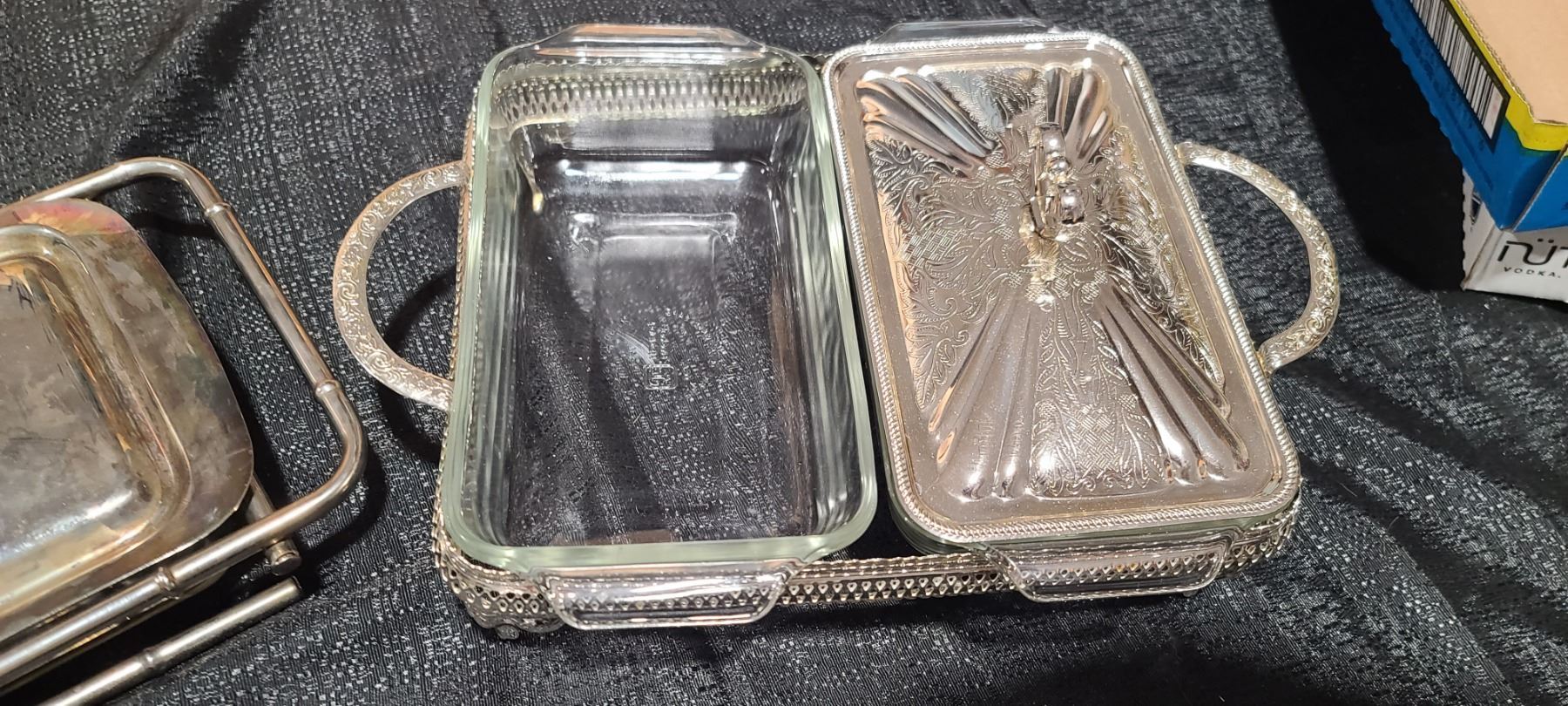 SILVERPLATED SERVING DISHES, GLASS DISHES (PYREX AND QUEEN ANNE)