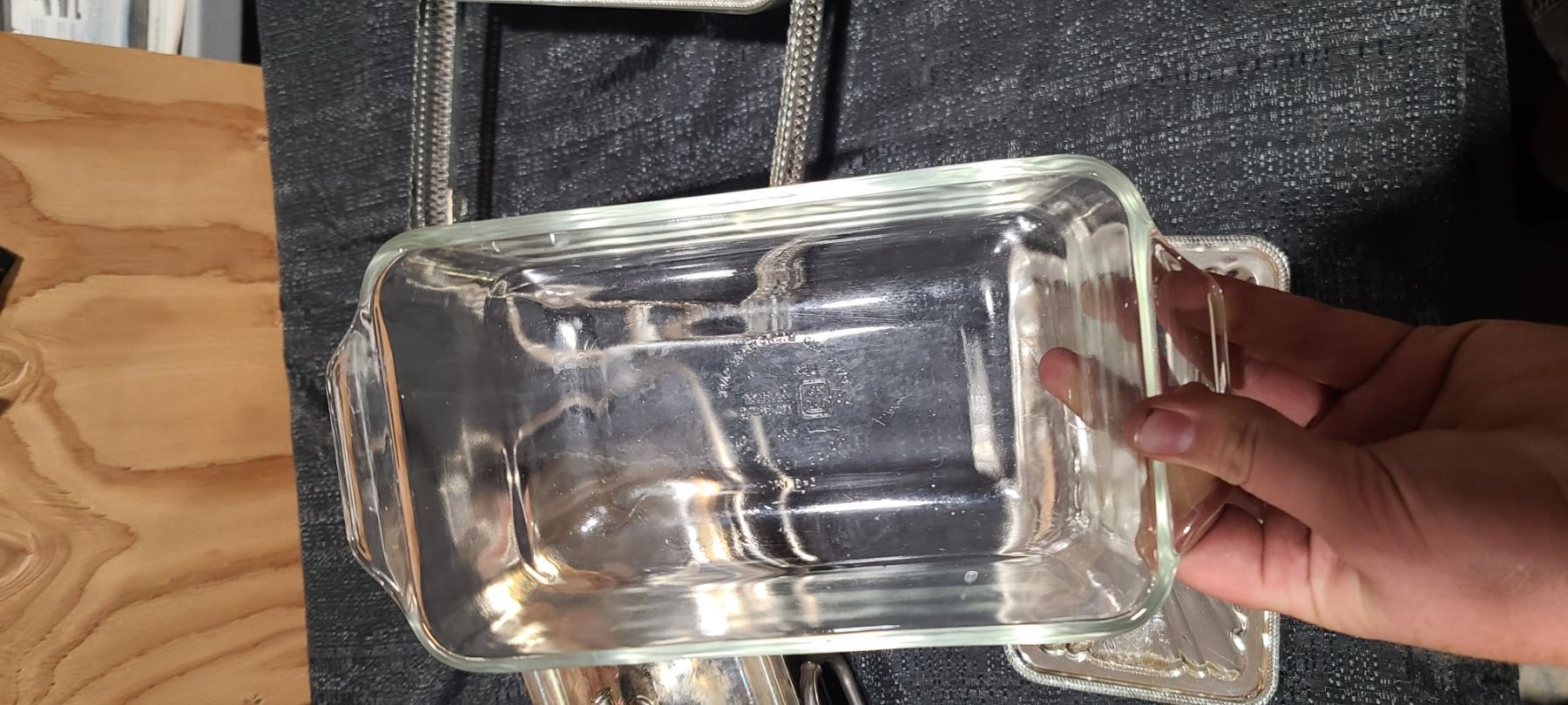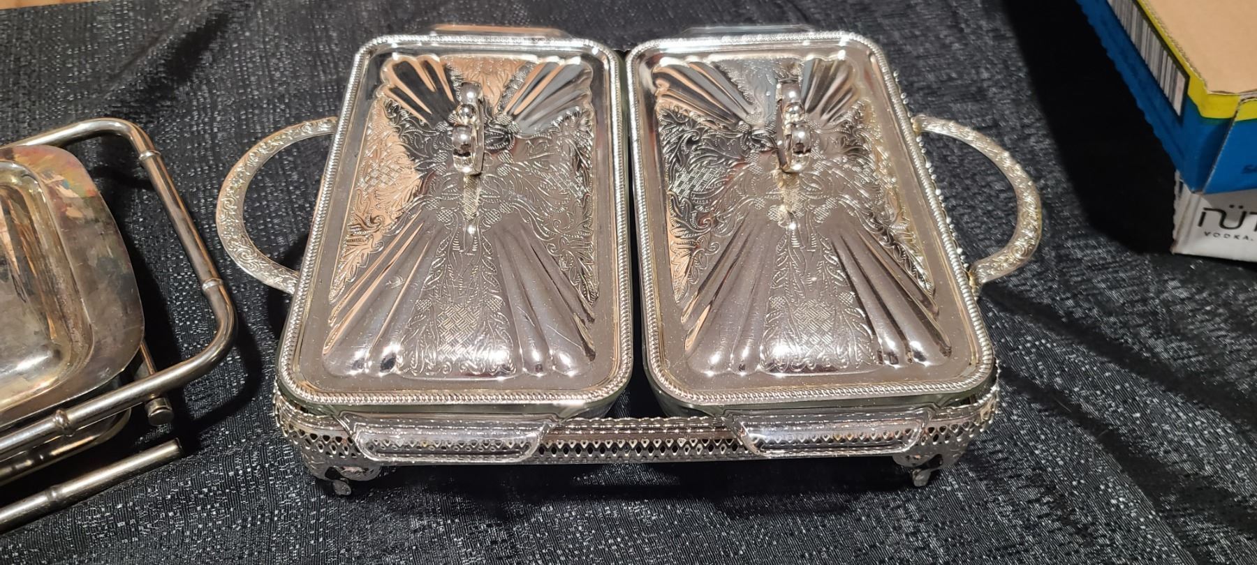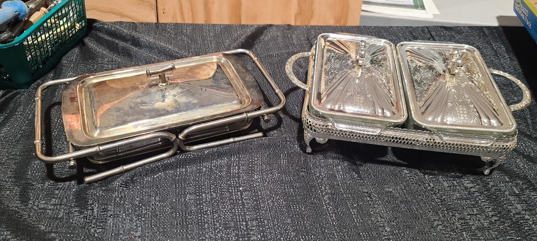 SILVERPLATED SERVING DISHES, GLASS DISHES (PYREX AND QUEEN ANNE)
