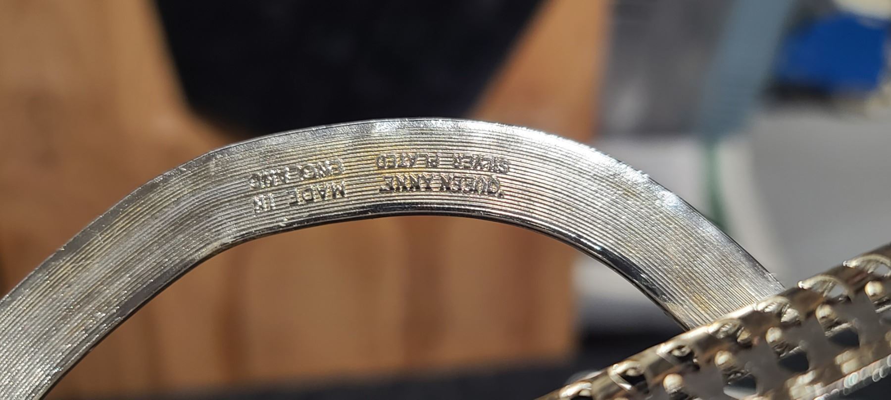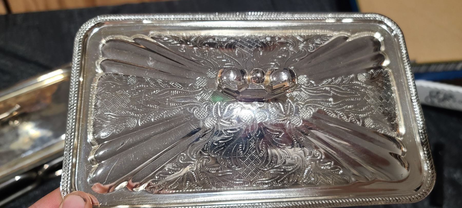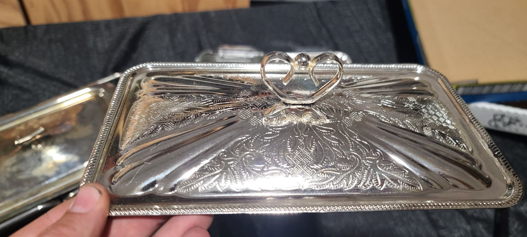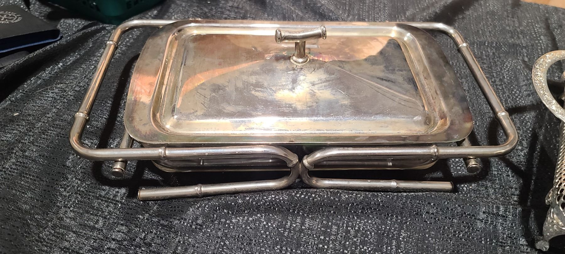 SILVERPLATED SERVING DISHES, GLASS DISHES (PYREX AND QUEEN ANNE)
