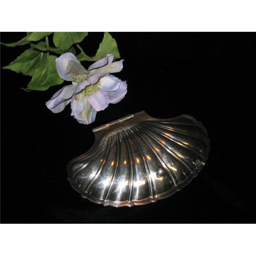 Very unusual Silverplate Shell Condiment Dish with a Frosted Glass Insert, totally removeable for easy cleaning. The glass is heavey for it's size. The Dish displays a spoon slot and a ball knob on the lid and three ball knob feet on the underside. The Hinge works freely. It is Hallmarked, but, I do not recognize the the sign. Hallmarked with FRE, with what appears to be a sickle, I can not be sure, along with another mark which is unknown to me. This Item is in MINT Condition.