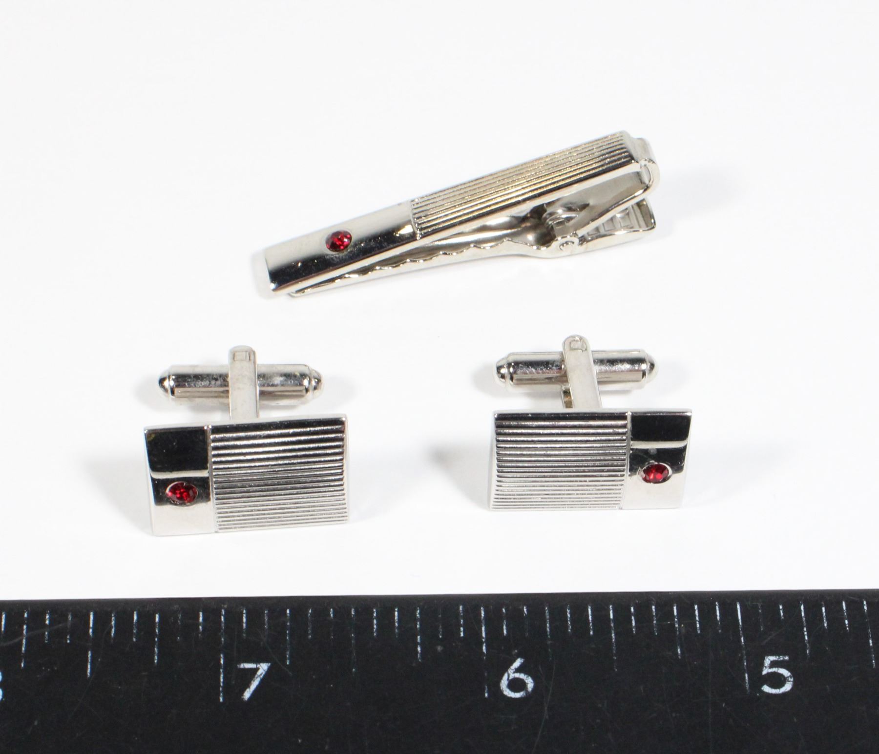 SILVERTONE CUFF LINKS AND TIE CLIP. RED RHINESTONE