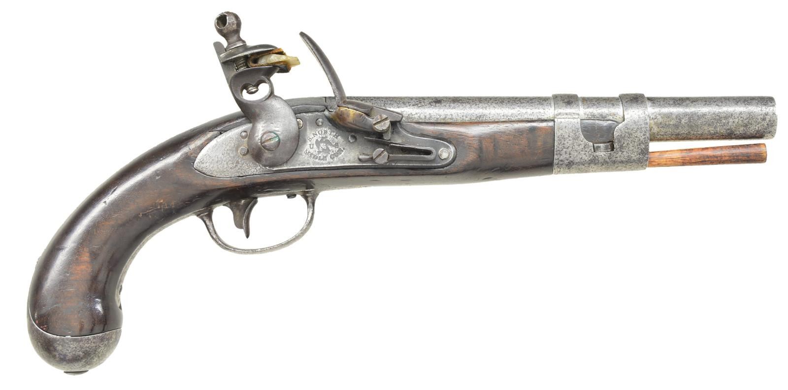 Cal. 69. NSN. Indistinguishable from North model 1813 army contract pistols other than 7” belt hook. Both are very scarce in original flint. New specifications for US military 1816 pistols reducing caliber from .69 to .54 left North with hundreds of proofed & inspected barrels for army, so enterprising Simeon North made contract with navy for purchase of 1000 guns that were delivered November 16, 1816. Some early texts refer to these as 1816 navy contract but not the case. This pistol conforms to 1813 with 9” barrel proofed “P / US” at breech, “HHP” (Henry H. Perkin) above touch hole. Flat beveled lock with unmarked tail, brass pan, “S NORTH / US / MIDDLN CON” with eagle. Stock inspected behind “ET” (Elisha Tobey), Wickham improved barrel band. CONDITION: very good overall, metal gray with staining and light pitting, stock sound with small putty repair rear of lock. (01-21492/JS). $4,000-6,000.