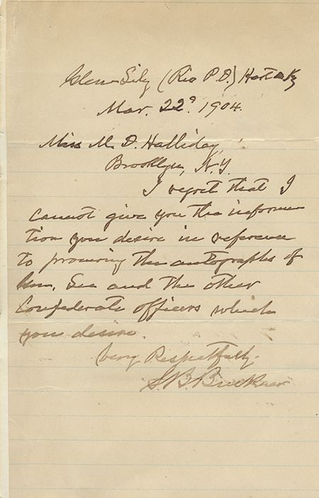 (1823-1914) Confederate major general who led his division at Perryville, Knoxville and in an abortive attempt of forces in the Trans-Mississippi. A.L.S. 1p. 8vo., Mar. 22, 1904, to an autograph collector regretting that he cannot obtain autographs of other CSA officers such as Lee. Tipped at left margin to another sheet, light wear, very good.