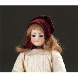 SIMON & HALBIG 905 CLOSED-MOUTH CHARACTER. An uncommon swivel-necked character with pale bisque, feathered eyebrows, and brown paperweight eyes on a straight wristed composition body. She is wearing an antique white dress and underwear, pink “Keystone” leather shoes, replacement dirty blond human hair wig, and an antique burgundy bonnet. This doll has a solid dome head. SIZE: 13” t. CONDITION: Overall condition is very fine, a few minor neck chips and normal wear to composition body. JL 1-4431 (1,200-1,400)