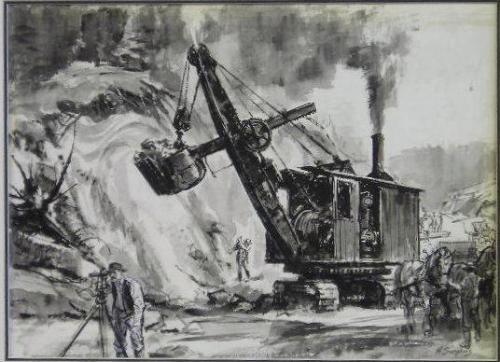 SIMPKINS, Henry John, A.R.C.A., 1906- . "The Construction Site". Aquarelle, signée. Watercolour, signed. 13 1/2" x 19" - 34.2cm x 48.2cm.