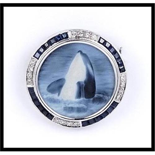 This beautiful brooch has a nice whale design in an onyx cameo and charming contrasting colors. This round cameo is surrounded by 16 square cut diamonds what weigh .15 carats TW and 24 square cut sapphires that weigh approximately 1.25 carats TW. The brooch measures 25 millimeters (1 inch) in diameter.