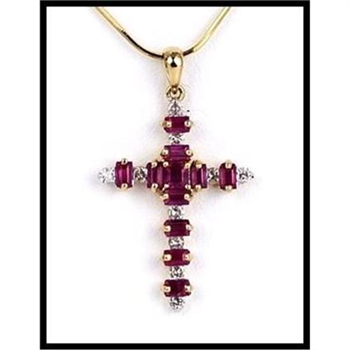 A classic cross is embellished by red rubies and diamonds. The 10 bag cut rubies weigh 1.40 carats and are set with 10 full cut diamonds that weigh .25 carats TW in 18K yellow gold. The pendant measures with bale 31 millimeters (1-7/32 inches) x 18 millimeters (15/32 inches).