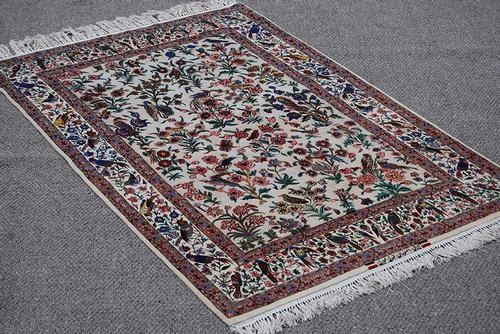 SIMPLY SPECTACULAR HIGH QUALITY PERSIAN ROYAL ISFAHAN, SIZE 5.9 X 3.9 FEET, MADE OF HIGH QUALITY SILK AND KORK ON PURE SILK FOUNDATION, NATURAL, VEGETABLE DYE, INCORPORATING A FASCINATING FINELY DETAILED BIRDS AND FLORAL PATTERN ON A WHITE COLORED BACKGROUND, CONTRASTED BEAUTIFULLY BY A DARKER COLORED INTRICATE FLORAL BORDER, A TRULY GREAT LOOKING RUG. HAND WOVEN IN ROYAL ESFEHAN, Iran.