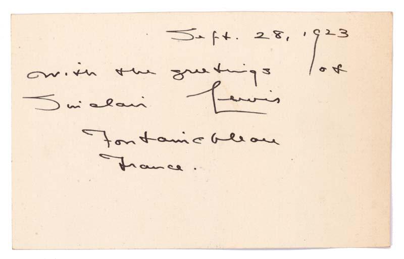 SINCLAIR LEWIS (1885 - 1951) American novelist, short-story writer, and playwright. In 1930, he became the first American to be awarded the Nobel Prize in Literature. Signed card “With the greetings of Sinclair Lewis, Fontainebleau, France”. 5” x 3”. Sept. 28, 1923 Mounting trace on verso. Fine.