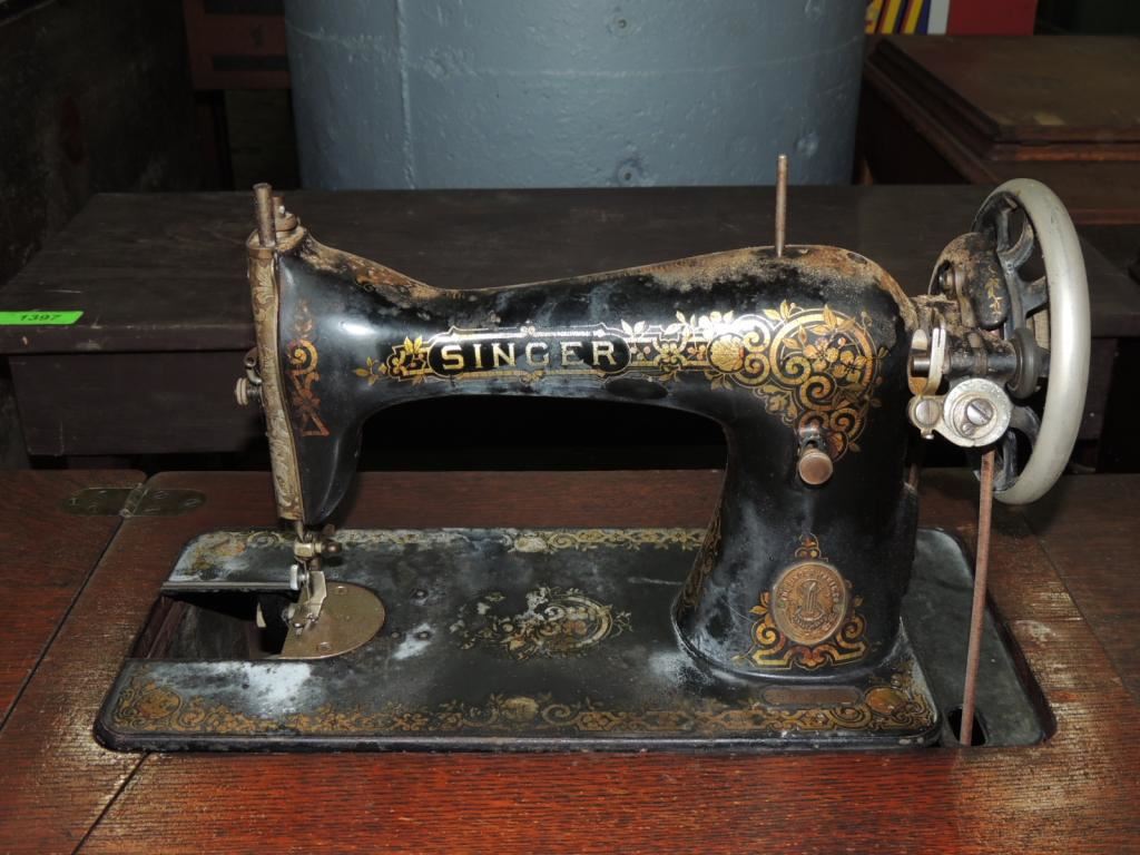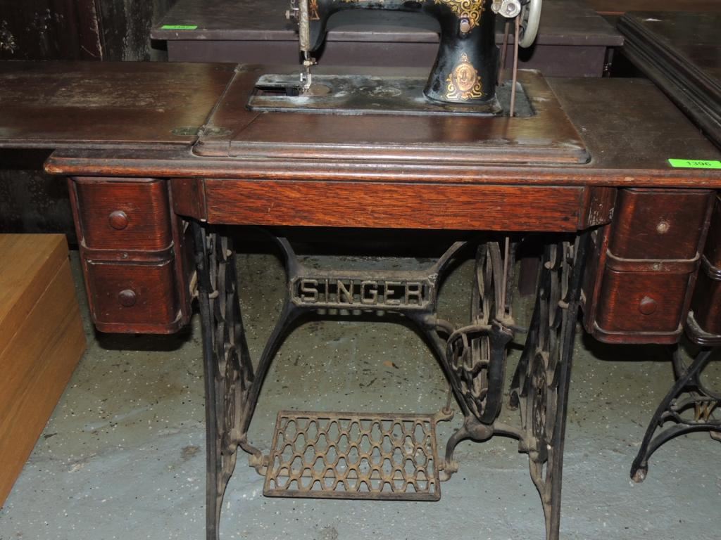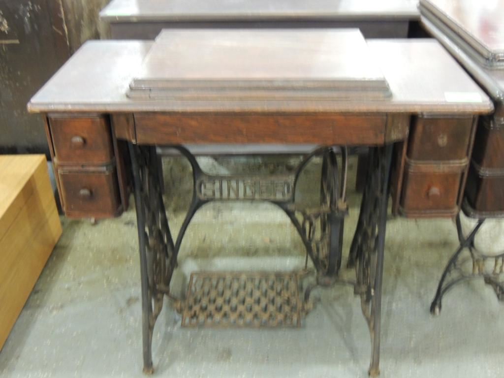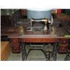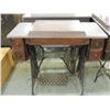 ANTIQUE SEWING MACHINE, CAST IRON BASE, FOOT PEDAL, SEWING MACHINE AND TABLE, STORAGE, ANTIQUE, GOOD CONDITION, COLLECTIBLE AS SHOWN SEE PHOTO FOR MORE DETAILS.